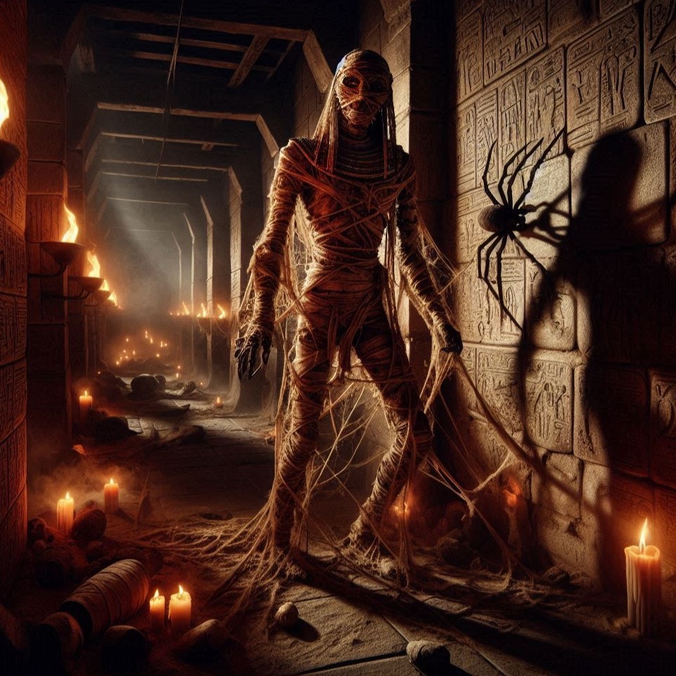 A dark cinematic ambient soundtrack unfolds with deep male vocals layered over vast pads, subterranean drones, and spectral synths, Whispering children’s choir echoes (key phrases) in the distance, amid tribal percussion, chimes, and ghostly effects, Slow, suspenseful, and immersive, it conjures ancient, echoing corridors with wide reverb and dynamic buildups dissolving into shadowy, soft ambient breaks