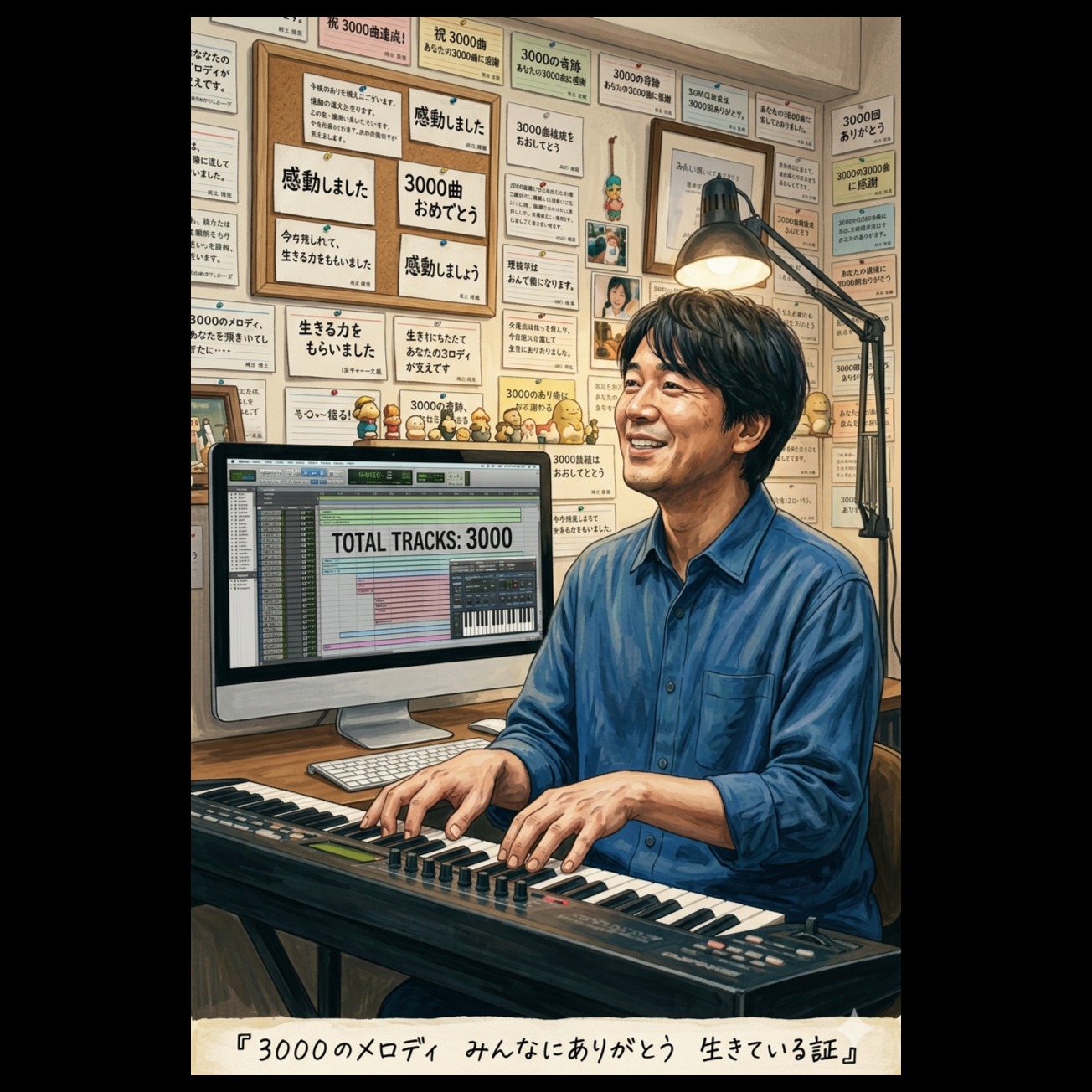 Folk song, Japanese folk, Minor, 72BPM, Male vocal, Acoustic guitar(fingerpicked arpeggios), harmonica(expressive bends), upright bass(soft pizzicato), snare brush drums(light swing), simple arrangement, Warm, nostalgic and humble storytelling about living proof, gratitude to listeners, overcoming hardship and continuing to create music