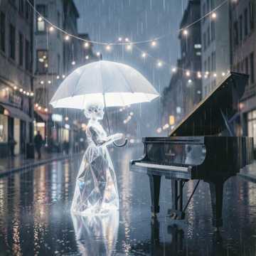 Folk, City Pop, New Age, Minor, 102BPM, Transparent male baritone vocal, Folk guitar(fingerpicking), Harmonica(bending), Viola(arco), Electric piano(chord comping), Drums(brushed), Orchestra(strings pad), Nostalgic rainy night, longing for a girl who only shows vulnerability during thunderstorms