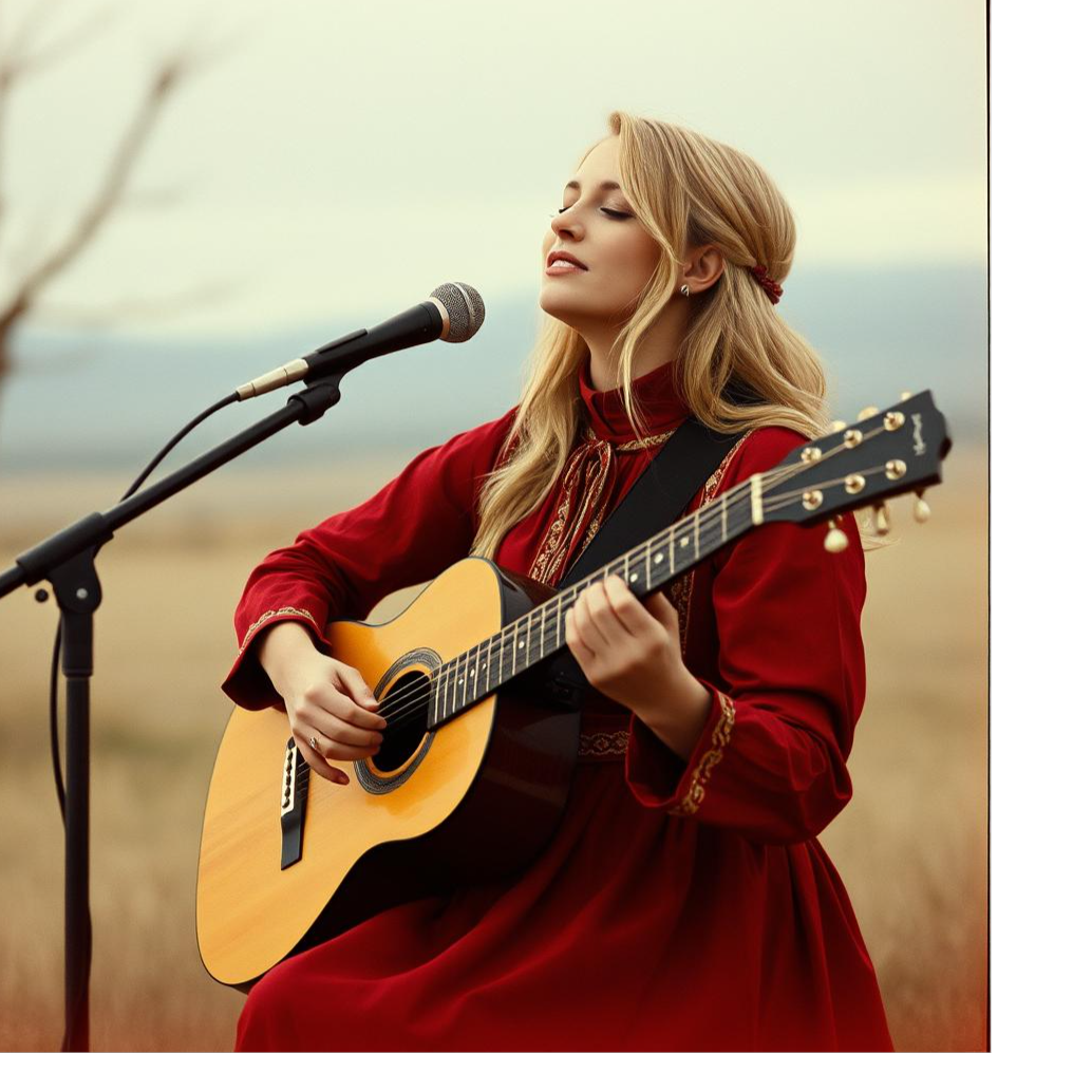 A Russian folk song with a female vocalist, accompanied by an acoustic guitar and a balalaika, The song is in a minor key, with a slow tempo, The female vocalist sings in a clear, expressive voice, with a slight vibrato, The acoustic guitar provides a gentle arpeggiated accompaniment, while the balalaika plays a counter-melody, The song has a melancholic and nostalgic mood, The song structure is verse-chorus, The production is clean and natural, with a focus on the acoustic instruments and vocals, There are no drums or percussion, The song features a prominent bell sound effect, which acts as a recurring motif