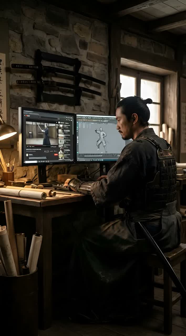 Epic hybrid of trap drums and taiko hits, cinematic strings and airy synth pads; verses stay tight and rhythmic, chorus opens into soaring gang-style chants, Male vocals in a steady mid-range, with stacked harmonies on the hook; subtle whooshes and impacts mark “cuts” and “strikes” to mirror animation beats, Slow build first hook, then final chorus hits with heavier low-end and widened stereo for a victorious finish