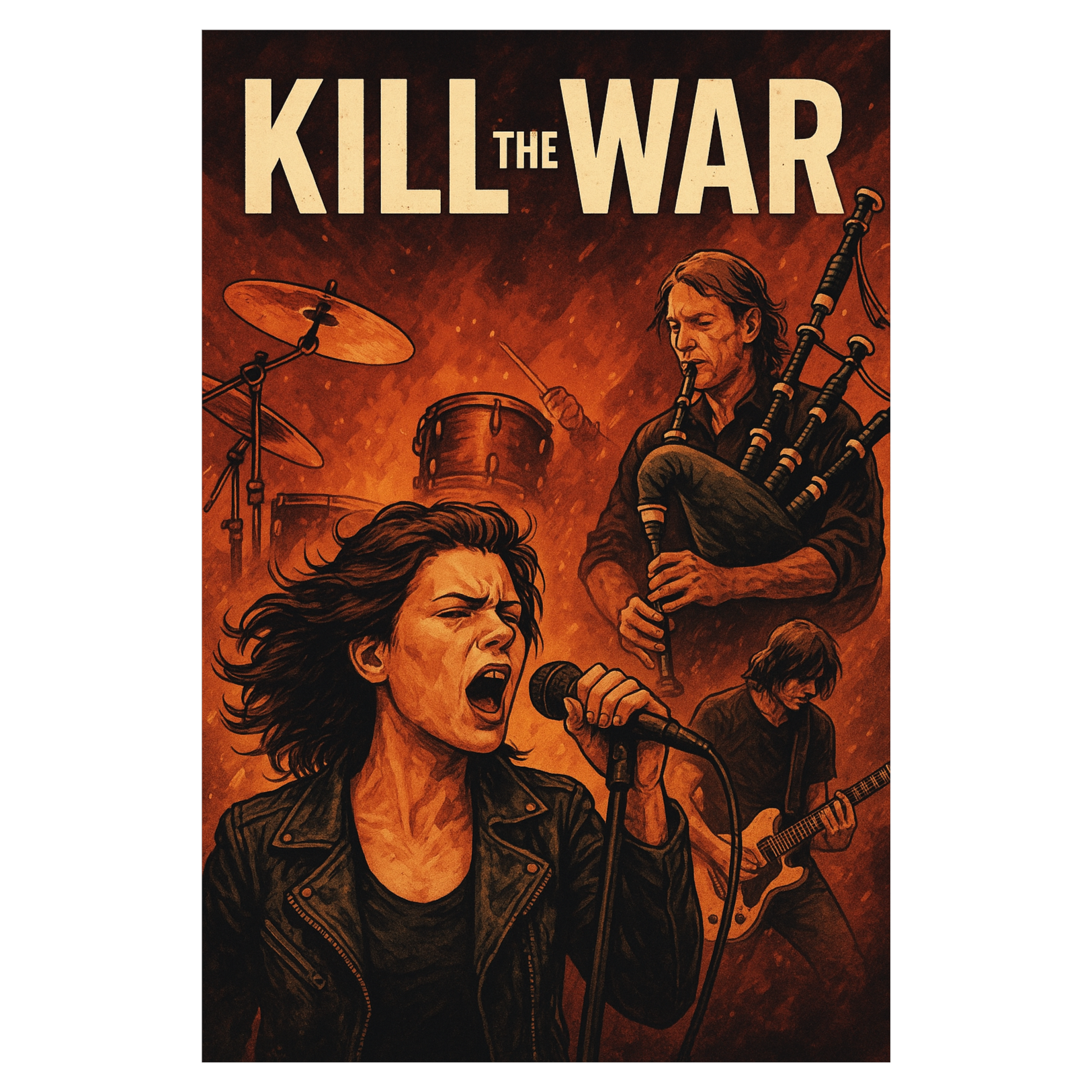Live concert with high responding crowd, Crowd clapping, crowd refrain singing, Powerful protest rock song starting with a long, intense drum solo, followed by spherical electric guitar riffs, Lead female singer with a smoky, rough and highly recognizable voice, Catchy repeating chorus, Deep bassline, driving rhythm, The song features a surprise bagpipe solo in the bridge, blending with electric guitars for a powerful, epic sound, Lyrics about refusing to join a coming war, in the style of "Imagine there's war, but no one goes", Cross rhyme structure, clear and direct English lyrics, strong anti-war message with quotes like "Violence kills the voice of reason", Energetic and emotional performance, stadium rock energy, wide stereo sound