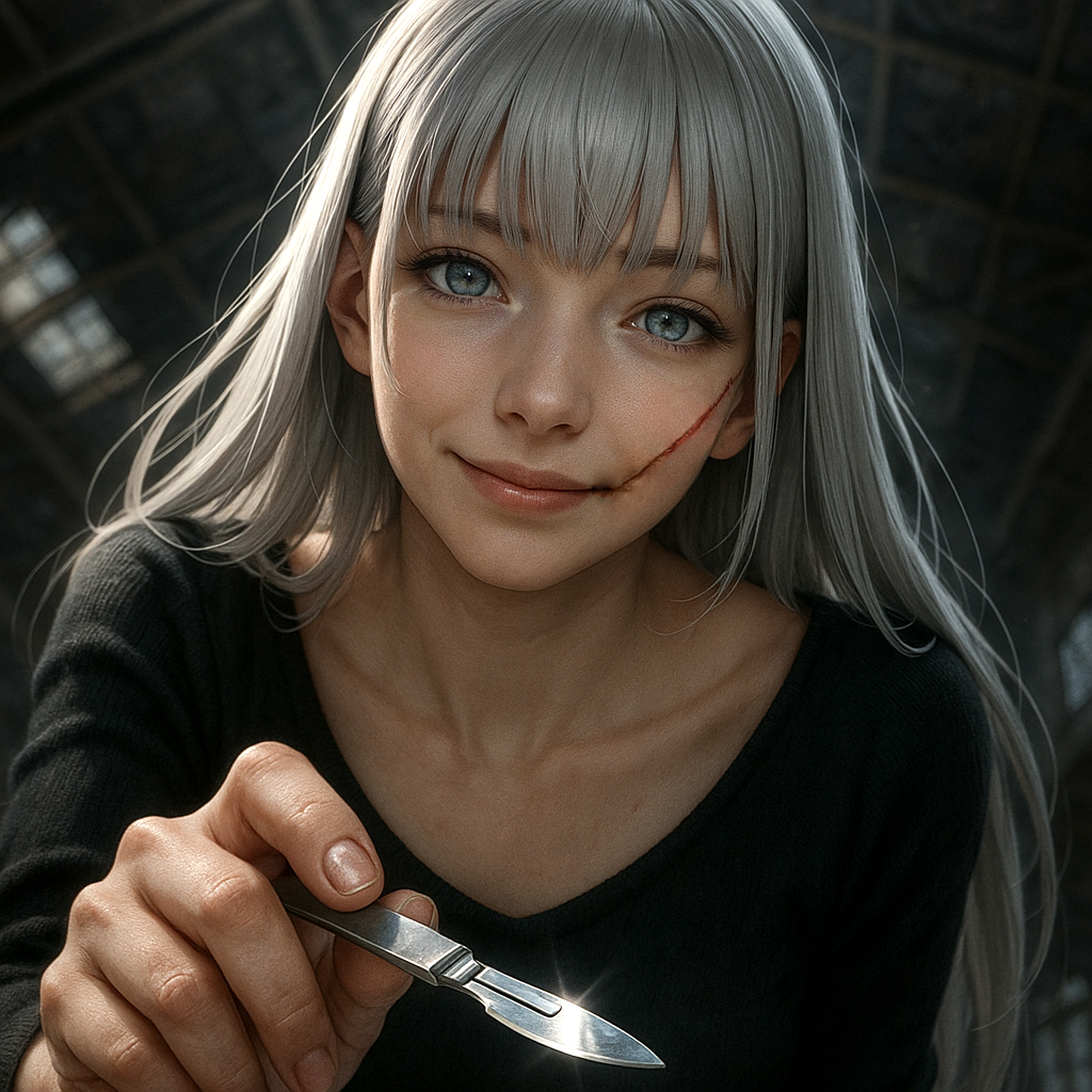 Dark Ambient pop × minimal industrial × horror Vocaloid; 88 BPM, F# minor, Soft-voice female lead with subtle formant/bit-aliasing (Vocaloid flavor), close-mic and breathy (not cute), Sparse mix; dry kick, sharp rim, sparse hats; heartbeat-pattern sub (irregular), metal-drag foley, valve hiss, glitch ticks, Motif: detuned music-box (±4–6 cents) + reverse-piano tails, Harmony: minor-2nd/cluster tension, Chorus: thin choir stack + bass swell (sidechained to vocal), Bridge: near-silence with distant bell (reverse swell into it), granular breath pad, Reveal moment: brief vocal formant drop and bit-depth kiss, Outro: final stinger hit + 1s tail to black, No guitars, Big negative space
