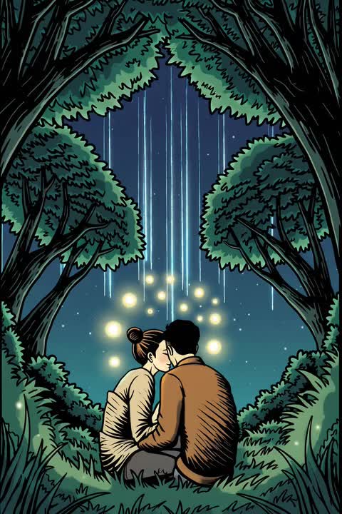 ambient forest lullaby, soft ASMR-style vocals, whisper male and gentle female voice, soft acoustic fingerpicked guitar, subtle night forest ambience with crickets and distant breeze, minimal instrumentation, slow calming pace, faint fire crackle, mellow textures, soft atmospheric pads, no beat, no bassdrum, no crescendo, cinematic whisper storytelling, melancholic but peaceful tone, meteor shower over pines, smooth dynamics, clean mix, sound fx