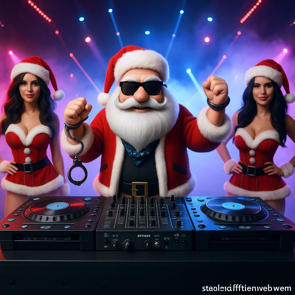 A relentless hard techno schranz track at 148 BPM, built on pounding, distorted gabber kicks and snarling 303 acid basslines, Industrial synth arpeggiators power through, layered with aggressive deep-voiced MC raps, battle-call vocal chops, and hypnotic chants, Turntablism dominates: scratching, transformer effects, backspins, and stuttering echo delays slash through breakdowns and drops, Distorted jingle bells and Santa samples mesh with warped Christmas chimes for festive chaos, all pumped through raw, unpolished sidechained club energy, Tempo shifts between 145-150 BPM intensify the underground, no-compromise vibe