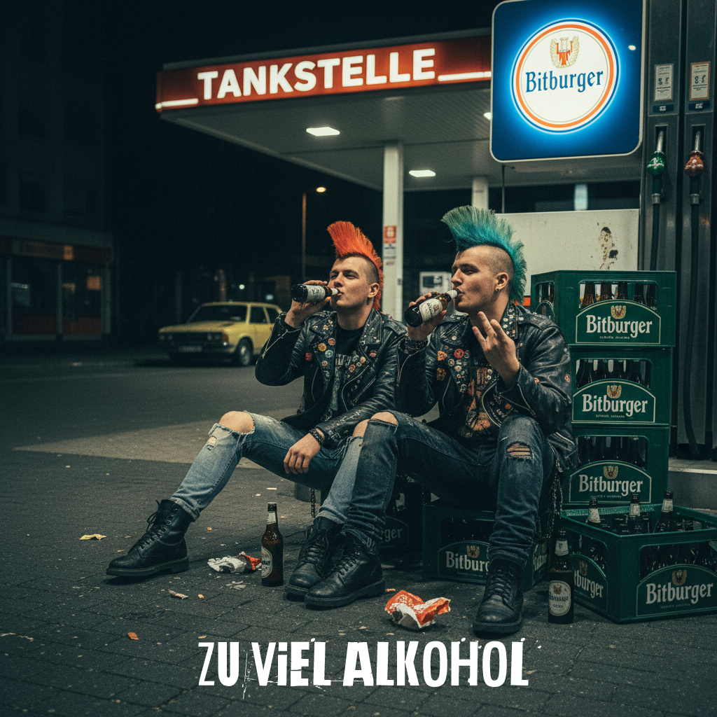 Raw punk rock and deutschrock collide with driven drums and aggressive bass holding down a tight groove, Deep, bassy male vocals cut through over distorted rhythm guitar, while lead guitar delivers edgy riffs and punchy licks, fueling the high energy, Verses are direct and explosive, with anthemic gang shouts in the chorus, and breakdowns allow for powerful dynamic shifts before lightning-fast endings