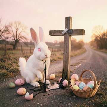 Psycho country doom gospel with dark rave undertones, Male vocal – deep and rough, gravelly preacher tone with slight distortion and tape saturation, southern accent, half-sung half-spoken like a haunted sermon, Mid-fast tempo (slightly driving), rhythmic acoustic guitar, distorted fiddle, low droning bass, punchy industrial percussion, subtle glitch textures, Atmosphere unsettling, surreal, religious paranoia mixed with twisted Easter symbolism, Build dynamics from tense verses to chaotic preacher outburst, keeping vocals upfront and clear, music energetic but not overpowering