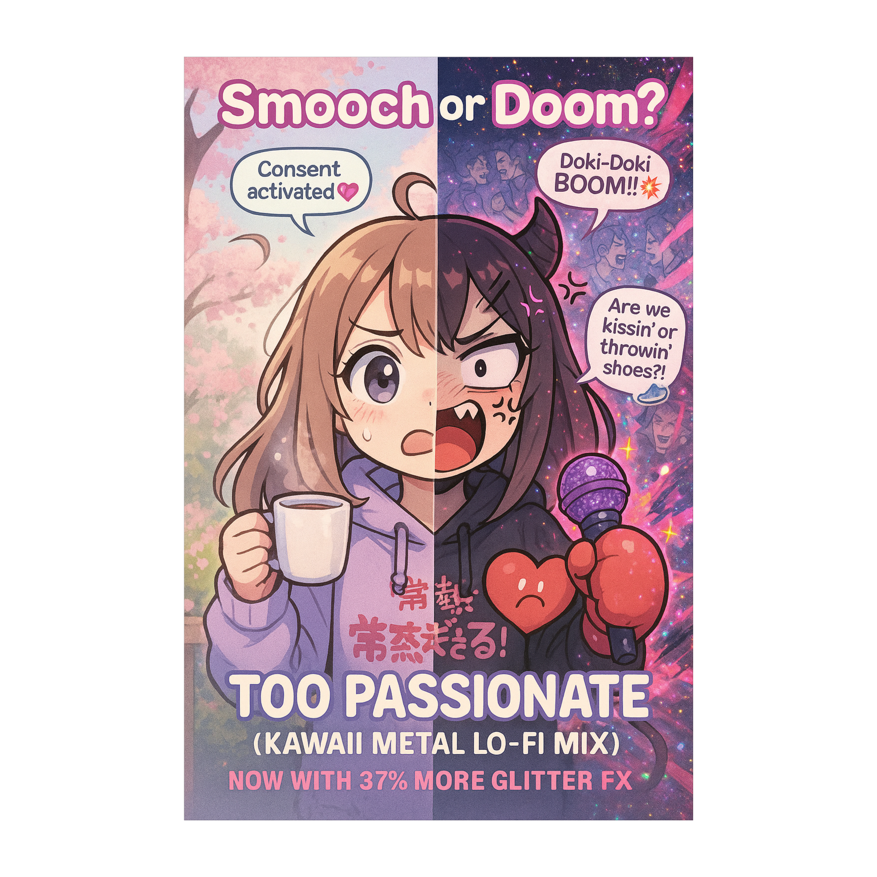 Suno Style Prompt: "Kawaii metal track with playful and comedic tone, Bright synth intro, heavy guitars, high-pitched cute vocals with occasional growls, Japanese phrases like ‘情熱的すぎる’ and ‘彼にキスして! Use a mix of bubble pop FX, metalcore riffs, and over-the-top energy, “Kawaii metal style, combining cute vocals and heavy riffs with Japanese phrases, ”