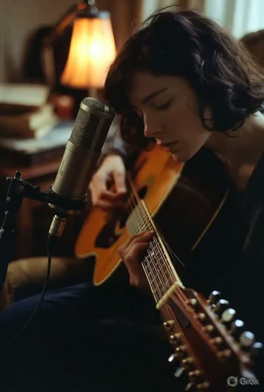 A melancholic indie folk song unfolds with raw, vulnerable energy, Close-mic 12-string acoustic guitar, fingerpicked for bright, chiming resonance, drifts in lo-fi warmth, A lone female baritone delivers breathy, whispered vocals—raspy and intimate over gentle tape-saturated textures and natural reverb