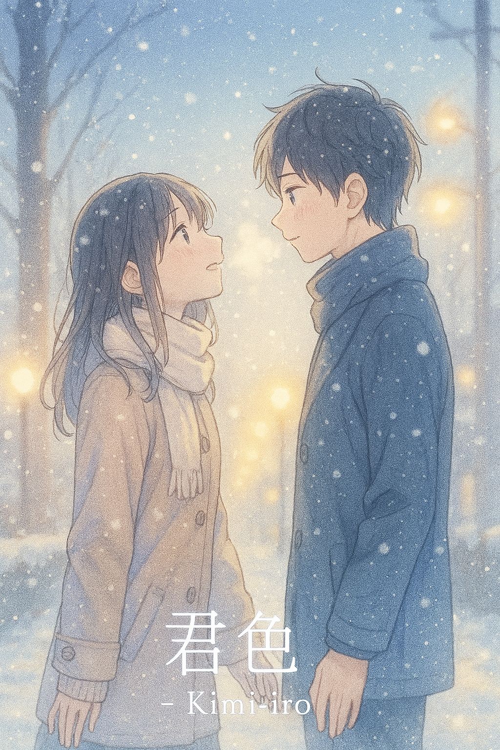 A gentle winter love ballad titled“Kimi-iro, ” inspired by emotional Japanese band ballads, Acoustic-guitar–driven arrangement with delicate fingerpicked arpeggios, Soft piano lightly supports, clean electric guitar adds subtle color, Drums are gentle, brush-like;bass is warm and round, Use subtle background strings that open slightly in the chorus, Add faint winter bells from the intro to create a cold, transparent atmosphere;brighten the bells a little in the pre-chorus, Chorus should feel warm, reflective, and airy, centered on acoustic guitar, Verses stay intimate, fitting themes of winter light, white breath, footsteps, quiet streets, and tender moments, Vocal:warm soft male vocal with slight breathiness, emotional mid-high tone, Bridge:acoustic-guitar arpeggio only, very close vocal, Last chorus:key change up a semitone, stronger bells, wider strings, deeper piano, thicker harmonies for a dramatic winter climax, Outro fades with guitar and distant bells, A heartfelt, sparkly winter ballad