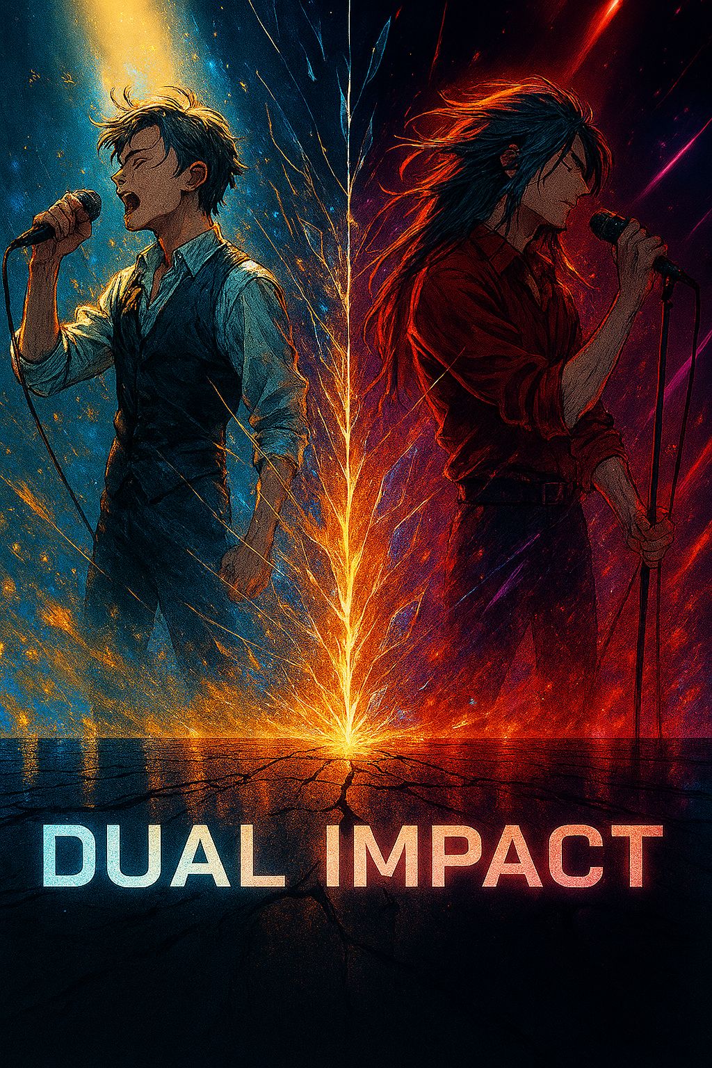 Cinematic J-Rock × Industrial Rock track titled “DUAL IMPACT” by virtual bands AURORA FIELD and CRYSTAL EDGE, Structure: Intro(Instrumental), Verse1, Verse2, Pre-Chorus, Chorus, Interlud, Verse3, Verse4, Pre-Chorus, Chorus, Bridge, Chorus, Last Chorus, Outro, Dual male vocals: one clear and emotional (Ren) and one low, metallic, restrained (Yoru), Their voices alternate and clash, never harmonizing, Ren’s side features piano, clean guitar, and organic drums with wide reverb; Yoru’s side uses glitch synths, distorted bass, and tight electronic percussion, Tempo 118 BPM, key D# minor, Pre-Chorus sections show vocal call-and-response, crossing left-right stereo, Bridge turns into a tense dialogue: one sings softly with hope, the other coldly defies it, Final chorus fuses both themes—melody overlaps but never resolves, Sound is dynamic, emotional, and cinematic, symbolizing light vs darkness, faith vs truth, Ends with both voices fading opposite directions into silence
