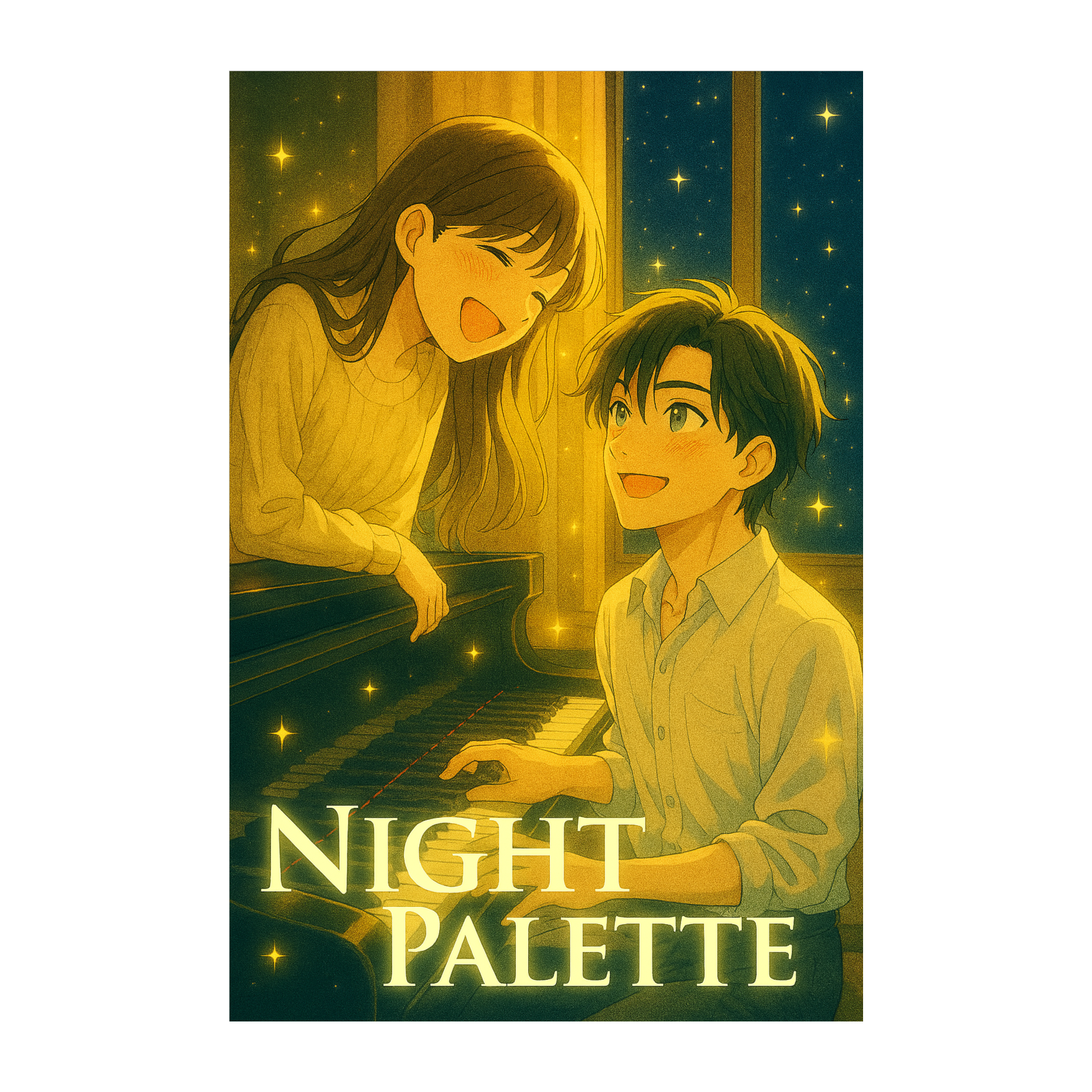 Neo jazz pop duet titled “Night Palette” by Ren(male)and Aria(female), Theme:two musicians paint the night with sound, Structure:Intro(Instrumental), Verse1, Pre-Chorus, Chorus, Verse2, Pre-Chorus, Chorus, Interlude, Bridge, Chorus, Last Chorus, Outro, Ren’s voice is clear, bright, and slightly high with silky resonance and airy tone, expressive yet gentle like light through glass—pure, emotional, and never deep or rough, His phrasing flows smoothly with piano lines, showing warmth and precision in every note, Aria’s voice is husky, velvety, and warm with smoky charm, slightly lower but strong and tender, creating balance and harmony with Ren’s clarity, They alternate every 4 bars in verses, like musical dialogue, Piano leads with emotional phrasing and soft dynamics, walking bass and brushed drums support softly, light guitar fills and subtle horns color the scene, Mood:moody, romantic, alive, ending with a soft piano fade