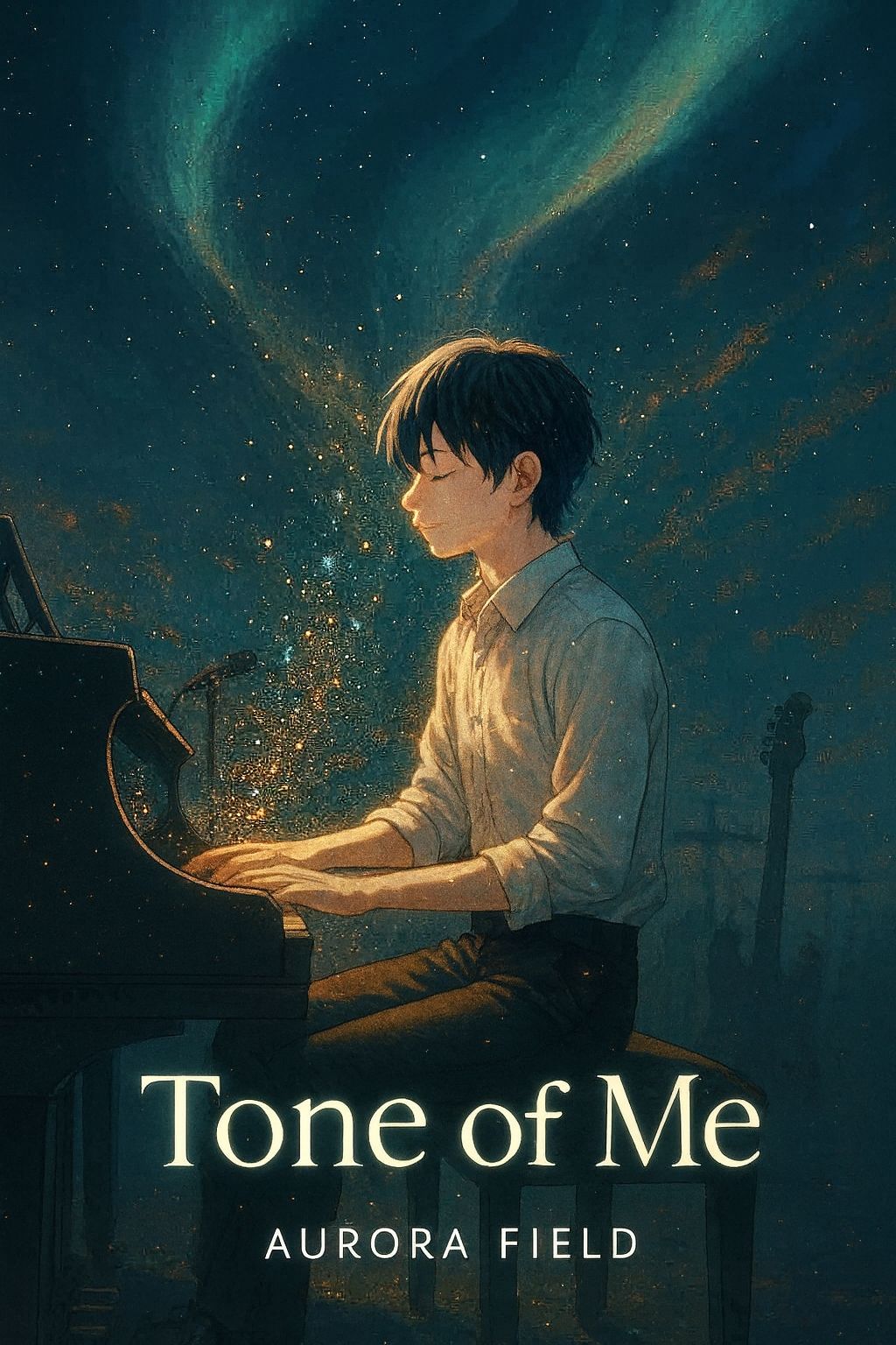 Emotional J-Rock / Post-Rock song titled “Tone of Me” by AURORA FIELD, led by Ren (male vocalist and pianist), Theme: realizing countless nearby sounds shape who you are, Structure: Intro, Verse1, Pre-Chorus, Chorus (piano only), Interlude (full band with powerful drums), Verse2, Pre-Chorus, Chorus, Interlude (band → piano solo & guitar arpeggio leading to Bridge), Bridge (piano and guitar fade into silence), Chorus (band builds up), Last Chorus, Outro (band fades to solo piano), Ren’s voice is clear, bright, and high in range with soft power and crystal tone—smoothly sustained, emotionally expressive but never shouted or rough, always melodic and resonant like shining air, His phrasing flows melodically with piano and guitars, carrying warmth and strength, The piano sounds delicate yet uplifting, guitars shimmer with delay textures, drums rise and fall in wide dynamics, bass adds depth, Mood: emotional, cinematic, alive, bursting into light and ending in quiet reflection