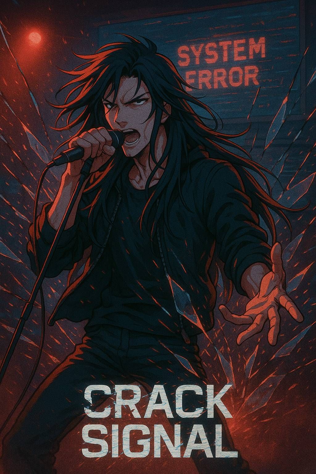Industrial J-Rock track titled “CRACK SIGNAL” by virtual band CRYSTAL EDGE, Structure: Intro(Inst), Verse1, Pre-Chorus, Chorus, Verse2, Pre-Chorus, Chorus, Interlude(Inst), Bridge, Chorus, Last Chorus, Outro, Japanese male vocal, low-mid tone, sharp and controlled delivery, metallic timbre with restrained emotion, Slight distortion and short delay for a cold industrial feel, Tempo 120 BPM, key G# minor, Sound blends distorted guitars, glitch synths, deep bass, and precise electronic drums, Theme: breaking false hope and confronting truth, Contrasts with AURORA FIELD’s “Glass Beat”, Intro begins with glitch noise and heavy synth bass, leading to verses with mechanical rhythm and biting vocals, Pre-Chorus builds tension with filtered guitars, Chorus erupts: “Break the code, crack the signal”, Bridge adds synthetic chaos and whispered phrases before final cathartic chorus, Mood is dark, cinematic, and mechanical—emotion suppressed until it bursts into rebellion