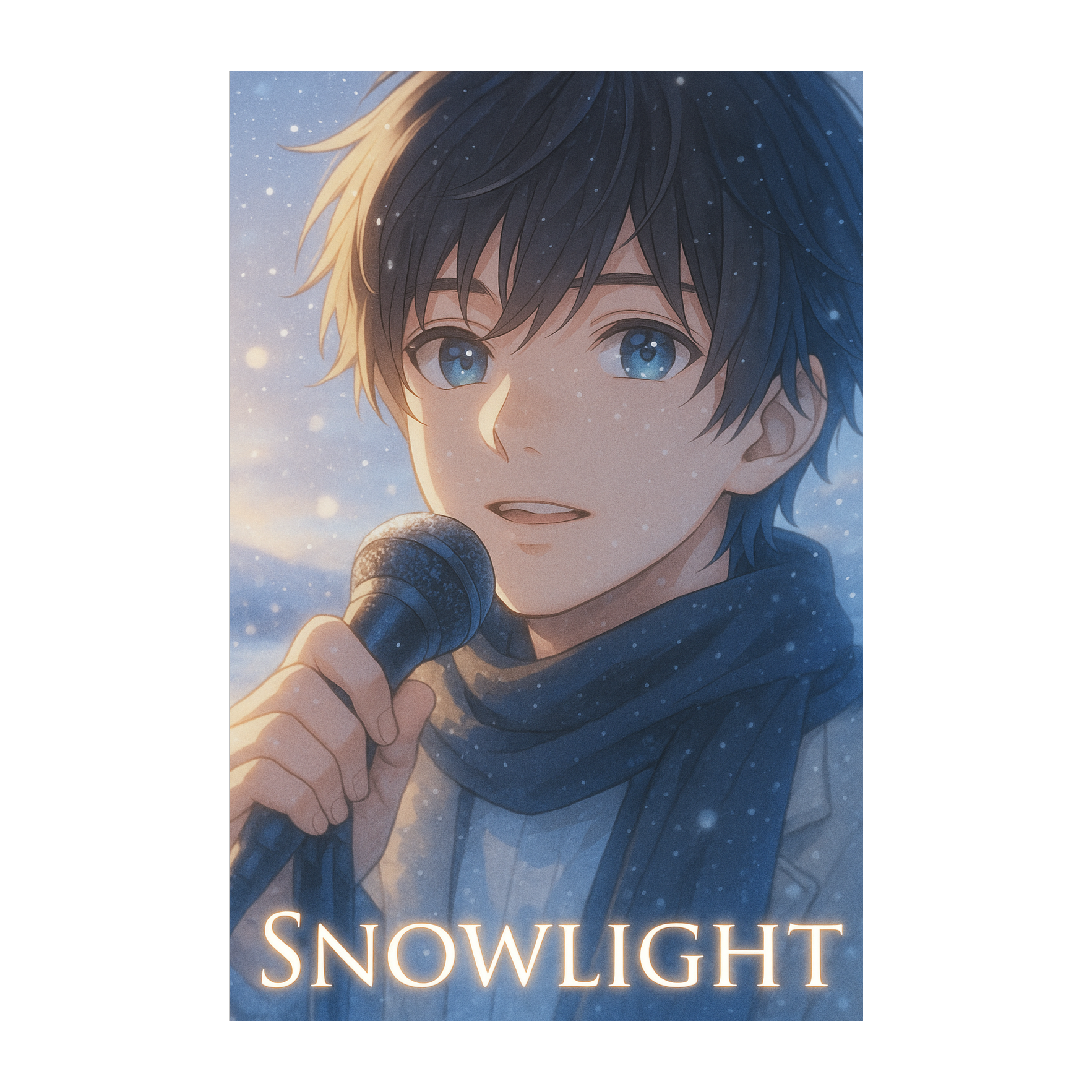 Emotional post-rock × ambient ballad titled “Snowlight” by virtual band AURORA FIELD, Structure: Intro(Instrumental), Verse1, Verse2, Pre-Chorus, Chorus, Interlud(Instrumental), Verse3, Verse4, Pre-Chorus, Chorus, Bridge, Chorus, Last Chorus, Outro, Tempo 100 BPM, key C# minor, The sound is transparent and cinematic, built around soft piano arpeggios, reverb-rich clean guitar, gentle bass, and atmospheric pads, Drums are light and expressive, with brushes and soft hits, rising in intensity at the final chorus, Male vocal (Ren) with clear, emotional tone sings with calm strength and warmth, expressing quiet hope after pain, His voice floats in space with subtle delay and reverb, conveying a feeling of snow and distant light, Each chorus expands with layered harmonies and echoes like falling crystals, The bridge introduces falsetto, symbolizing healing and rebirth, Mood: quiet, reflective, luminous, fragile but hopeful, Ends with fading piano echoes and whisper “Snowlight…”