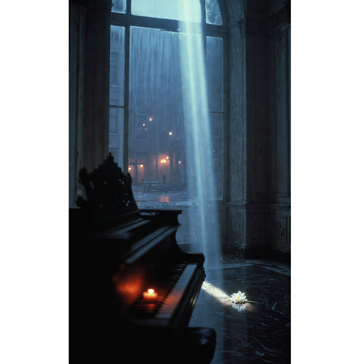 A piano-driven New Wave and indie pop base opens with sparse, echoing keys and moody synths, Cinematic strings weave melancholy through each section, Subtle trip hop beats pulse beneath haunting male vocals, with ethereal children’s choir and orchestra layering dreamlike textures in chorus and outro