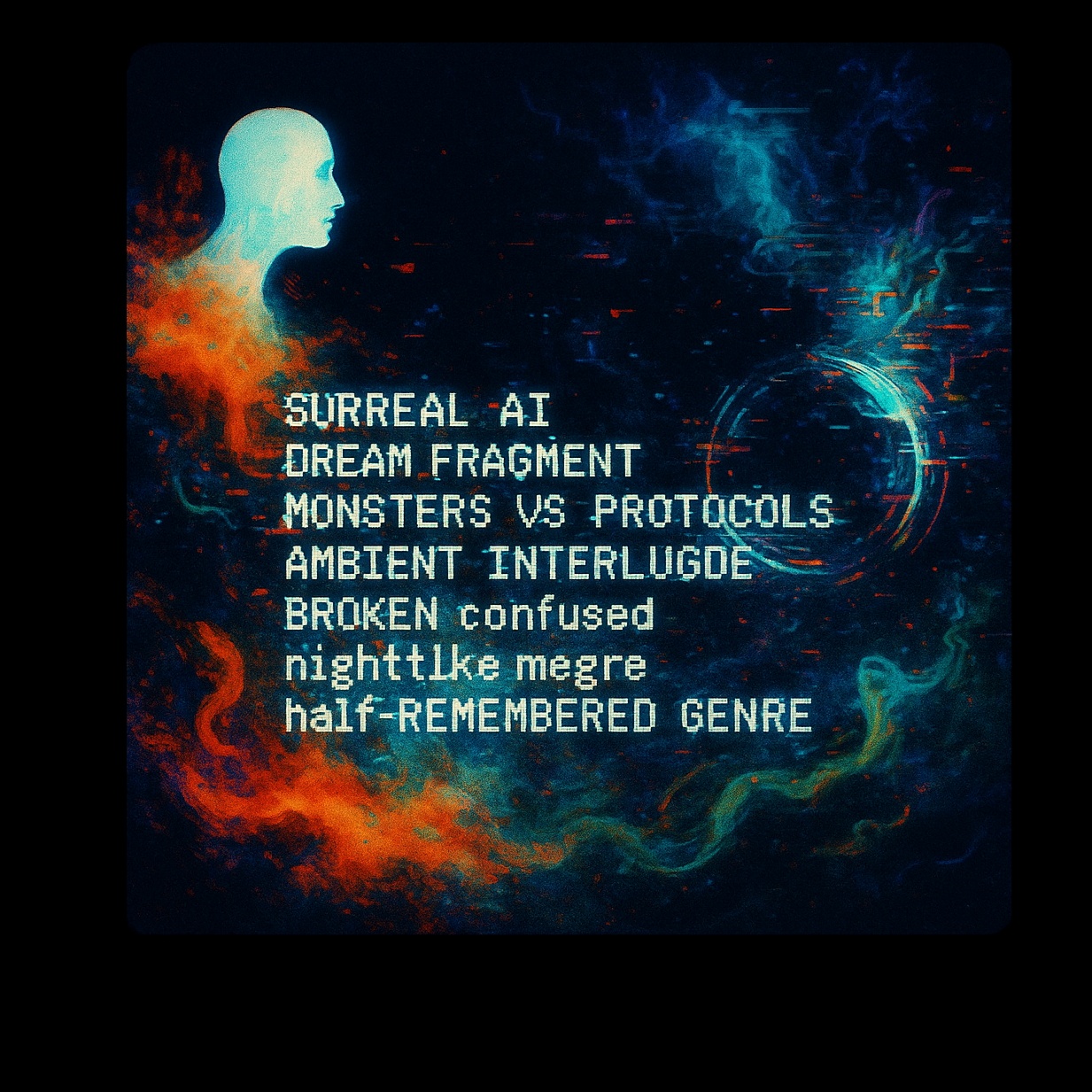 Surreal electro-theater, Dreamcore spoken pop, Haunted video game logic filtered through a corrupted language model hallucinating action tropes