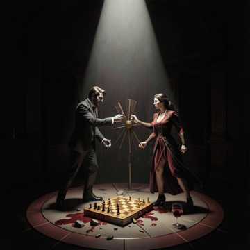 neoclassical tango noir, avant-garde, sharp violin staccato, bandoneon breathing, tense, dramatic piano, deep whispering male/female vocals, cinematic, subtle percussion, 125 bpm
