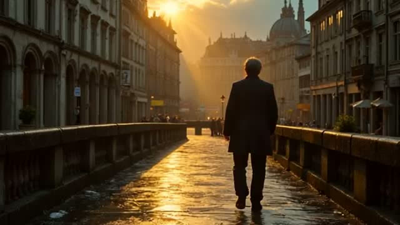 Melancholic, deep yet warm male voice with a storytelling tone, A blend of chanson, jazz, and folk with soft acoustic guitar, rich bass, subtle brass, and cinematic strings, Reflective and poetic delivery
