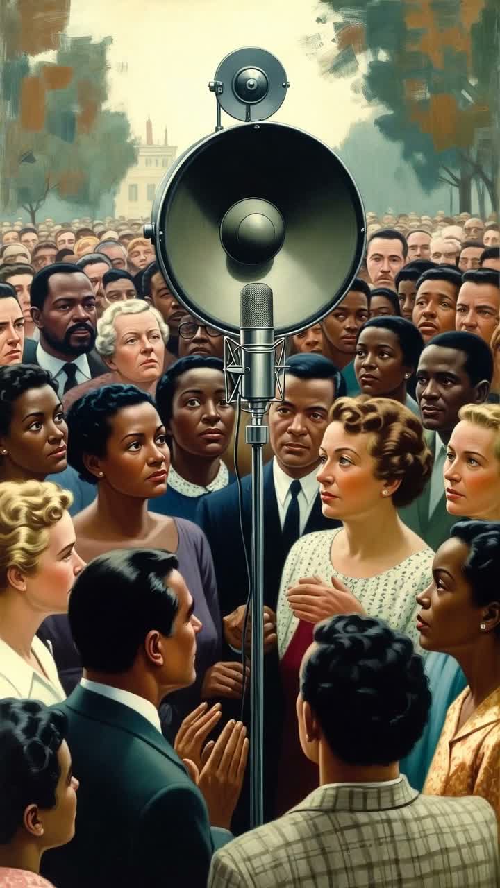 Vintage mid-century public address narration, measured and resolute, speaking about unity and perseverance during uncertain times, set to a chill downtempo ambient house track, with vocal collage plundephonics influence