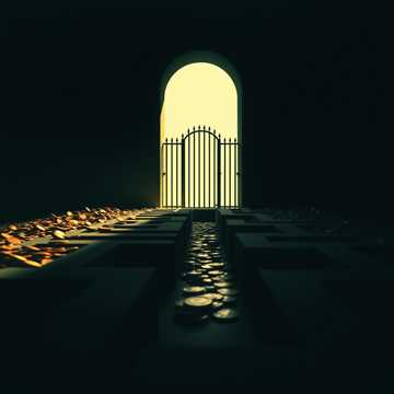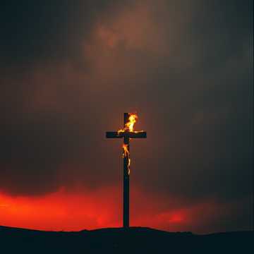 rock, a haunting organ weaving through the mix, gospel, and vocals that are reverberant, pounding drums, ethereal; layered electric guitars with static-laden effects, rock gospel, otherworldly, and commanding, distorted