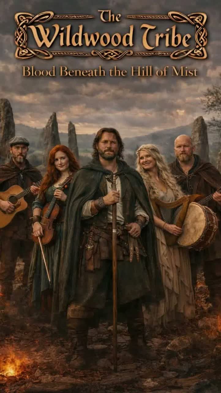 A 6/8 Irish/Medieval epic folk track in d minor, opening with bouzouki/bagpipe drone, low whistle, and women humming, Verses use acoustic guitar, soft bodhrán, and gritty baritone, with verse II adding men in octave, Pre-chorus builds bodhrán and adds male drone, women’s breathy echoes, The refrain bursts into full band, deep male unison, soaring female thirds, and expansive lead, Bridge strips to mystical, two-part female voices over drone and whistle, The final refrain becomes hymn-like and broad, with elongated endings, Outro: women hold a sustained tone while men speak the last line, fading to silence