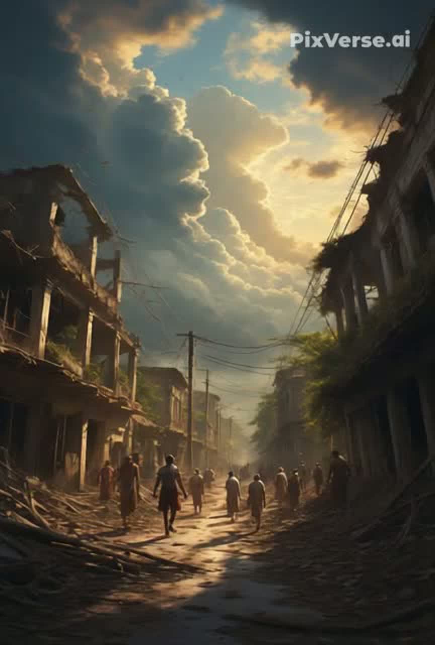 Melodic symphonic metal, emotional male vocal, deep and resonant, atmospheric intro with wind and distant thunder, blend of sorrow and hope, orchestral strings, light steel drums and trumpets rising in chorus, dramatic build toward epic climax, conveying devastation transforming into unity and rebirth, BPM 78