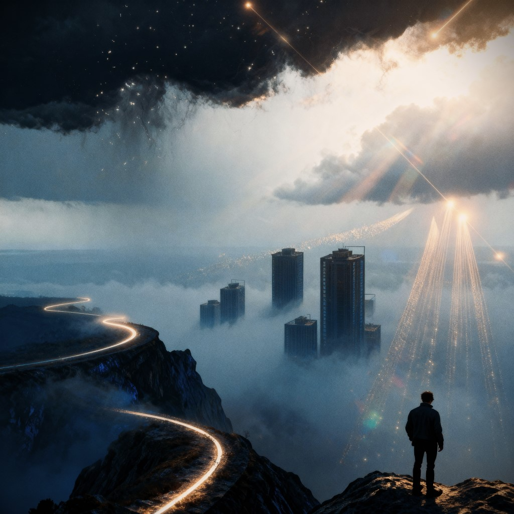 A pulsing synth motif kicks off, anchored by deep bass and precise, syncopated drums, Verses stay minimal with sparse keys and sharp guitar licks, Choruses bloom with wide atmospheric pads, evolving piano, dynamic percussion, and hints of strings and distant brass, A textural breakdown swells, leading to a powerful electronic-orchestral outro