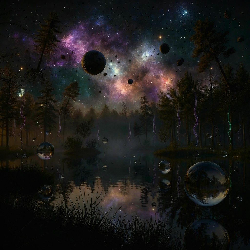 Ambient textures open with airy synth pads, atmospheric effects, and deep, rumbling sub-bass to evoke cosmic vastness, Choral spherical vocals float above minimalist piano, pulsing electronic layers, and subtle orchestral swells, Midsection brings a rising sense of awe with shimmering bell accents, before dissolving into a serene, luminous fade led by echoing choral harmonies and reverb-drenched synths