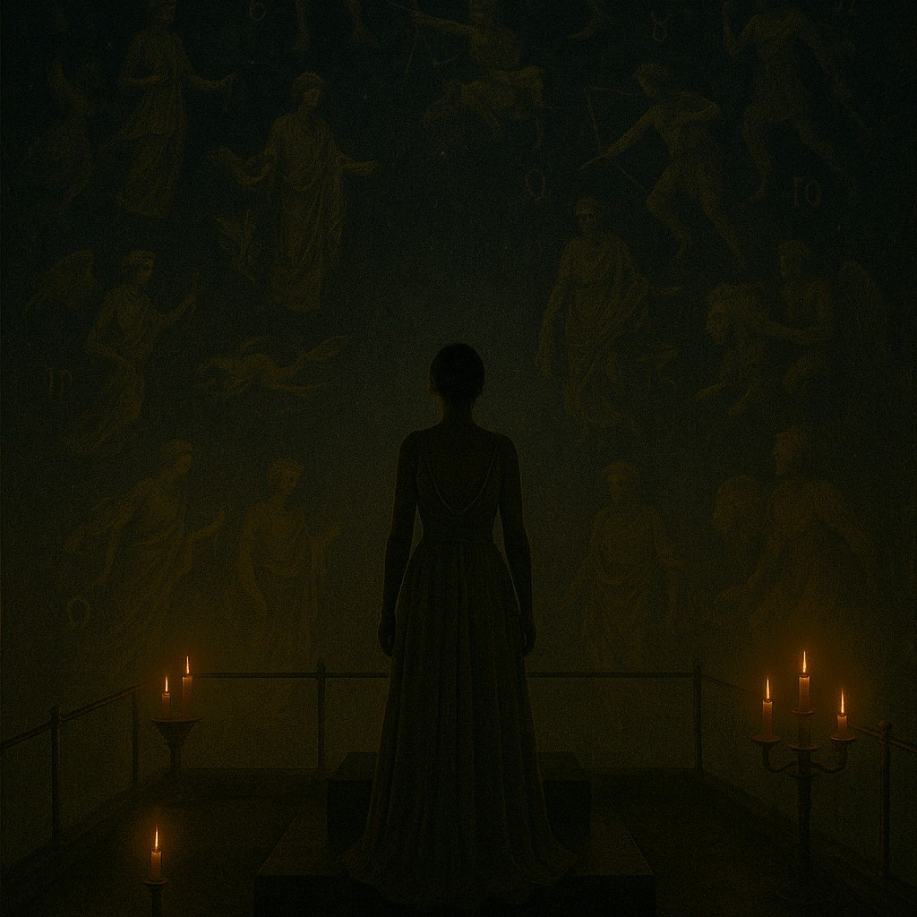 Opening with deep ambient soundscapes and atmospheric pads, the arrangement unfolds into elaborate synthwave textures layered over pulsing bass drums and soft, meditative rhythms, War drums thunder beneath enigmatic dark vocals and ethereal female humming, interwoven with Gregorian chants and angelic, reverb-heavy vocal layers, building a spiritual, cinematic new age epic