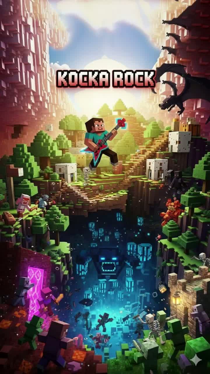 A high-energy pop-rock track with crunchy electric guitars, 8-bit game effects, driving drums, and punchy bass, Hungarian / English male vocals sing Minecraft-themed lyrics about mining, crafting, Creepers, Endermen, Zombies, Skeletons, and the Warden, with a big shout-along chorus