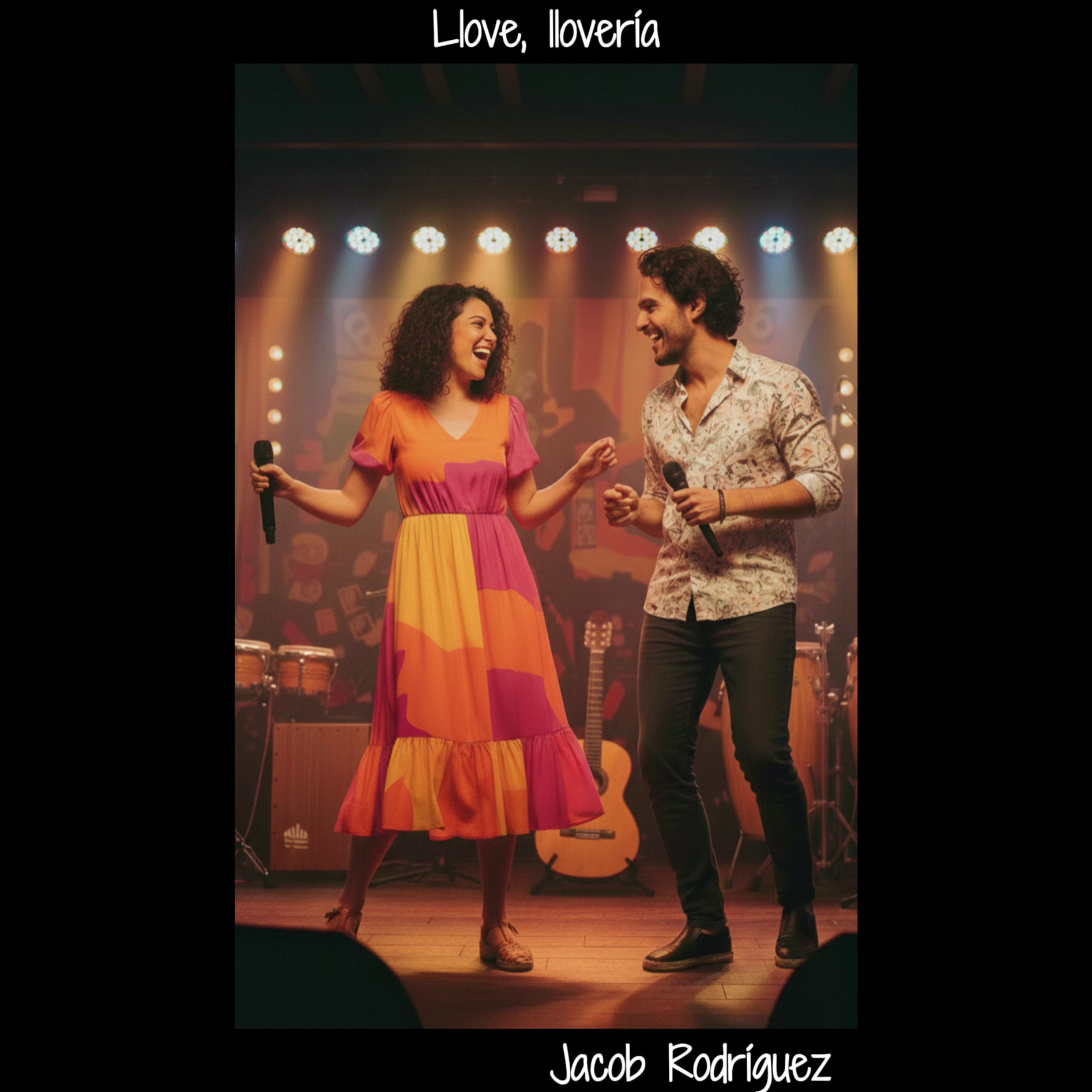 Create a lively, cheerful Spanish rumba with lyrics including the hook: “Llueve, llueve, llovería / Llueve, llueve, llovería / Llueve, llueve, llovería todo el día”, Structure: Intro with hook, light percussion, palmas, rhythmic guitar, Verse 1: clear, warm, playful vocals, guitar and soft palmas, Pre-chorus: build energy with percussion, palmas, bongos, Chorus / Hook: full rumba rhythm, percussion, cajón, rhythmic guitars, optional backing vocals, Verse 2: melodic variation, playful, Final chorus: higher energy, optional female backing vocals, full percussion, Mood: bright, positive, danceable, fun, Instruments: Spanish rhythm guitar, cajón, palmas, bongos, warm bass; optional melodic fills, Vocals: expressive, playful, clear; subtle harmonies in chorus optional, Emphasize key phrases rhythmically (“rompan las gotas la monotonía”), keep joyful, danceable flow