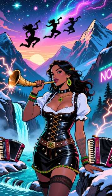 MELODIC ROCK, Funked, Yodel, Yodeling, Rock & Roll, ALPHORN, Dreher, LANDLER, Wubs, Bayrische Volksmusik, 145bpm, Traditional Alpine Yodeling: Rooted in Swiss/Austrian folk, Folk Ballad Imagery: Nature, valleys, mountains, rivers, EDM / Festival Energy: “Insane Drop” and scatting sections make it club-ready, Hybrid Performance: accordion, alphorn, cowbells, but also remixed with electronic beats
