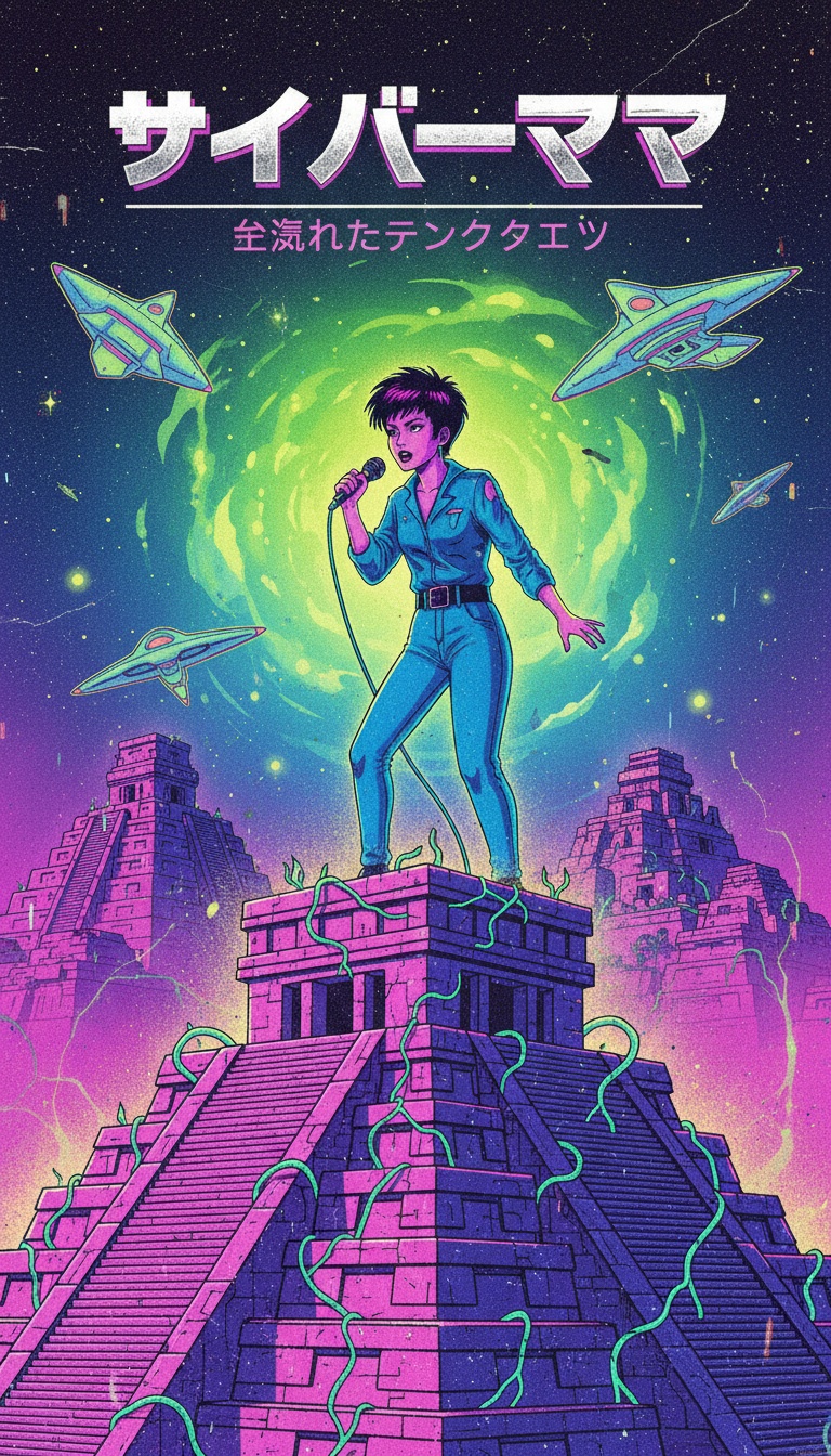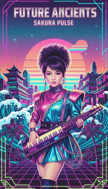 Genre: Futuristic cyberpunk rock with 80s DNA, Tempo: mid-fast, driving but hypnotic, All instruments are built from bass synthesis (basstillery), Drums: No real drums, Rhythm is created by pulsing low-frequency waves (30–50 Hz), layered and sidechained, forming a tribal cyber-groove, Bass: Warm melodic mid-bass with analog chorus and saturation, Acts as rhythm, harmony, and hook, Guitars: Simulated from resonant bass harmonics, Bright, emotional sustain, surf-rock attitude, like chrome guitars under neon rain, Pads: Generated from filtered bass overtones, glowing, slow, atmospheric, futuristic, Mood: Playful, rebellious, slightly eerie, Cyberpunk night city, ancient language in future club culture, Mix: Heavy low-end, wide stereo, no acoustic instruments, retro-futuristic, cinematic, bold, ‑strong vibrato, ‑dramatic, ‑loud, ‑aggressive, ‑fast