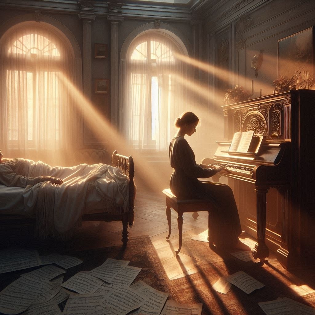 mournful piano melody paired with a gentle, melancholic string arrangement with rhythmic percussion, female vocals