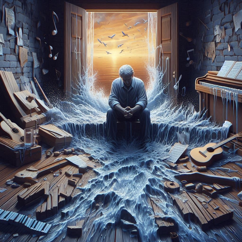 Folk rock, soft acoustic melodies, mournful ballad, melancholic, soft piano, acoustic guitar, harmonica, choral vocals
