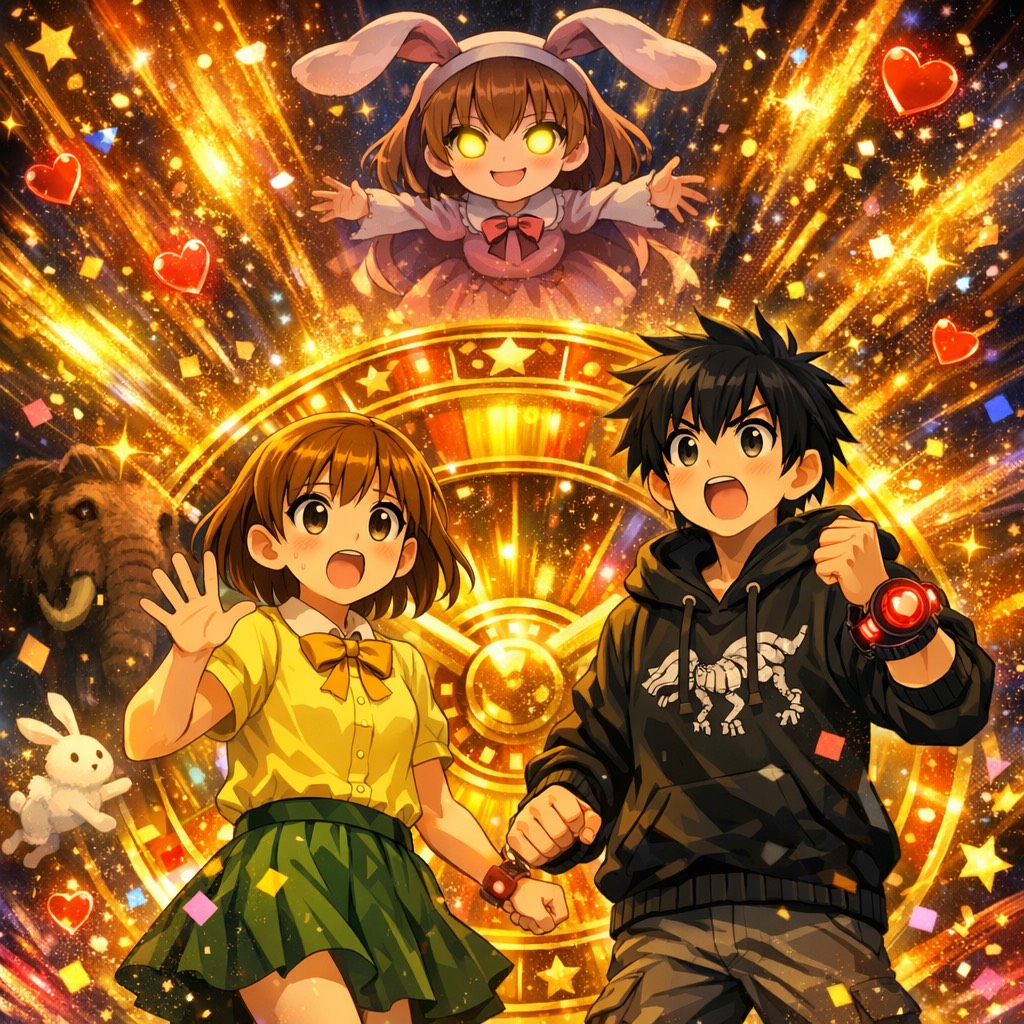 Upbeat cinematic J-pop with playful narration, bright parade-style intro, energetic rhythm, cute character voices, and chaotic time-travel comedy vibes, Cheerful trumpets, festive fireworks, lively percussion, Include spoken dialogue sections, SFX cues (warp sound, prehistoric ambience, footsteps, fanfare), and comedic timing, Keep vocals clear, animated, and expressive, Mix of male and female voices, Fun, colorful, fast-paced adventure feeling
