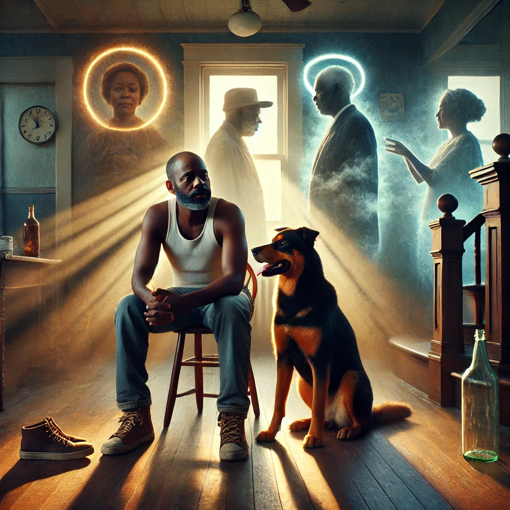 Start with heater hum, tape hiss, low thunder, and soft Rhodes chords, Boom-bap drums fade in under a heartbeat bass, During the *Fort Riley* memory, drop percussion—add stair creak, muffled shouts, shoe thud, brief laughter that melts into a melancholy piano loop, Hook brings drums back with a ghostly female hum of “longer than January, ” Bridge uses organ and upright-bass heartbeat for the spoken reflection, Final verse swells with faint strings and choir pads, then fades to organ, single bass pulse, and Ace’s collar jingle, **Mood:** nostalgic, sacred, healing, cinematic, **Goal:** make the listener feel your memories turning pain to peace