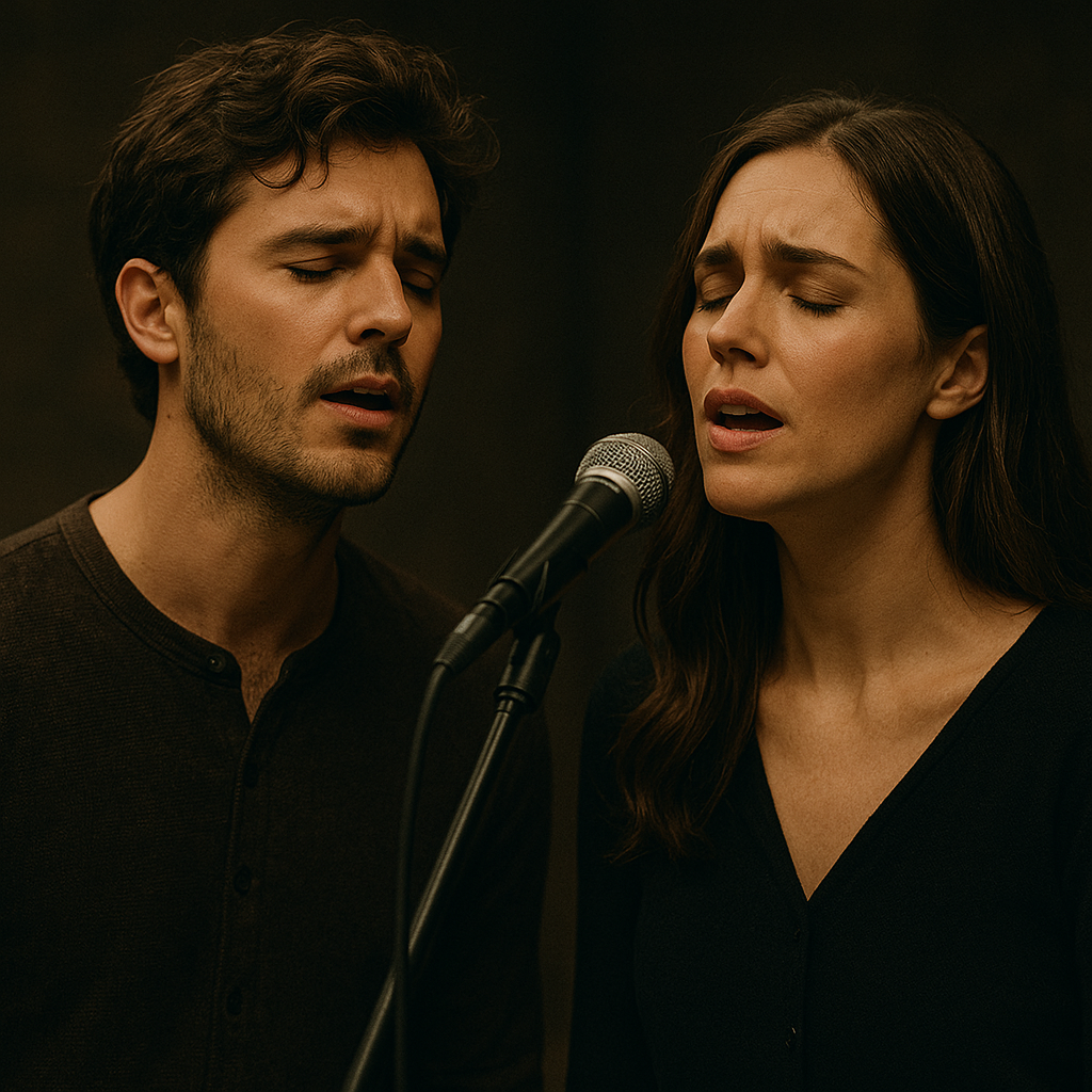 A dramatic, cinematic indie-folk song featuring two distinct vocalists: one FEMALE voice and one MALE voice, The FEMALE vocalist sings with a soft, breathy, emotional tone, using gentle vibrato and intimate delivery, The MALE vocalist has a warm, smooth, resonant tone with steady, heartfelt phrasing, Instrumentation includes fingerpicked acoustic guitar with spacious, echoing arpeggios, a deep melodic bass, soft brushed drums, and subtle ambient textures, The song is in a minor key with a slow tempo, creating a reflective, dramatic mood, Production is wide, atmospheric, and cinematic with reverb and stereo depth, The FEMALE sings her own verses, The MALE sings his own verses, They do not overlap or alternate within a single section, They sing together only in the choruses, Song structure: Female Verse → Female Verse → Male Verse → Male Verse → Female Pre-Chorus → Male Pre-Chorus → Chorus (BOTH) → Female Bridge → Male Bridge → Final Chorus (BOTH)