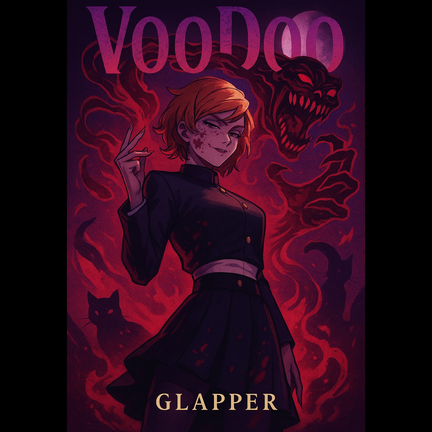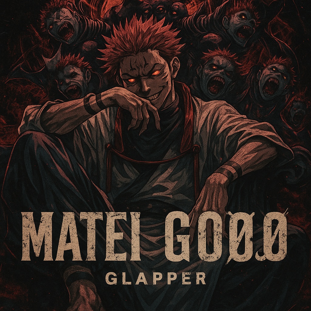 A dark and aggressive fusion of trap metal and horrorcore with glitchy industrial textures, Heavy distorted 808s, harsh hi-hats, dark ambient synths and evil atmospheric backgrounds, Vocal style should be gritty, demonic and energetic, with layered screams and vocoder effects on certain words, The energy must match the chaotic power and sarcasm of a powerful anime villain, Sukuna from Jujutsu Kaisen, The beat should be fast-paced (around 150-160 BPM), with sudden drops and switches that feel unpredictable and violent