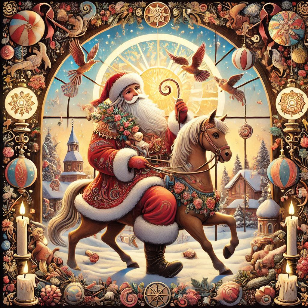 An epic pagan metal opener erupts with tremolo-picked guitars, thunderous double-kicks, and ritualistic choral synths, Nyckelharpa and flutes carve folk melodies through verses, deepening as choirs and heavy riffs heighten the wintry energy, Sudden shift: playful sleigh bells, Motorik grooves, hypnotic bass, and airy synths merge with cycling phasing guitars, Percussion and tape swells layer in, building to bold, 8-bit-driven choruses pulsed by retro drums, syncopated bass, and swirling arps, The bridge drops tempo, layering bitcrushed effects, before erupting back into the driven, festive finale