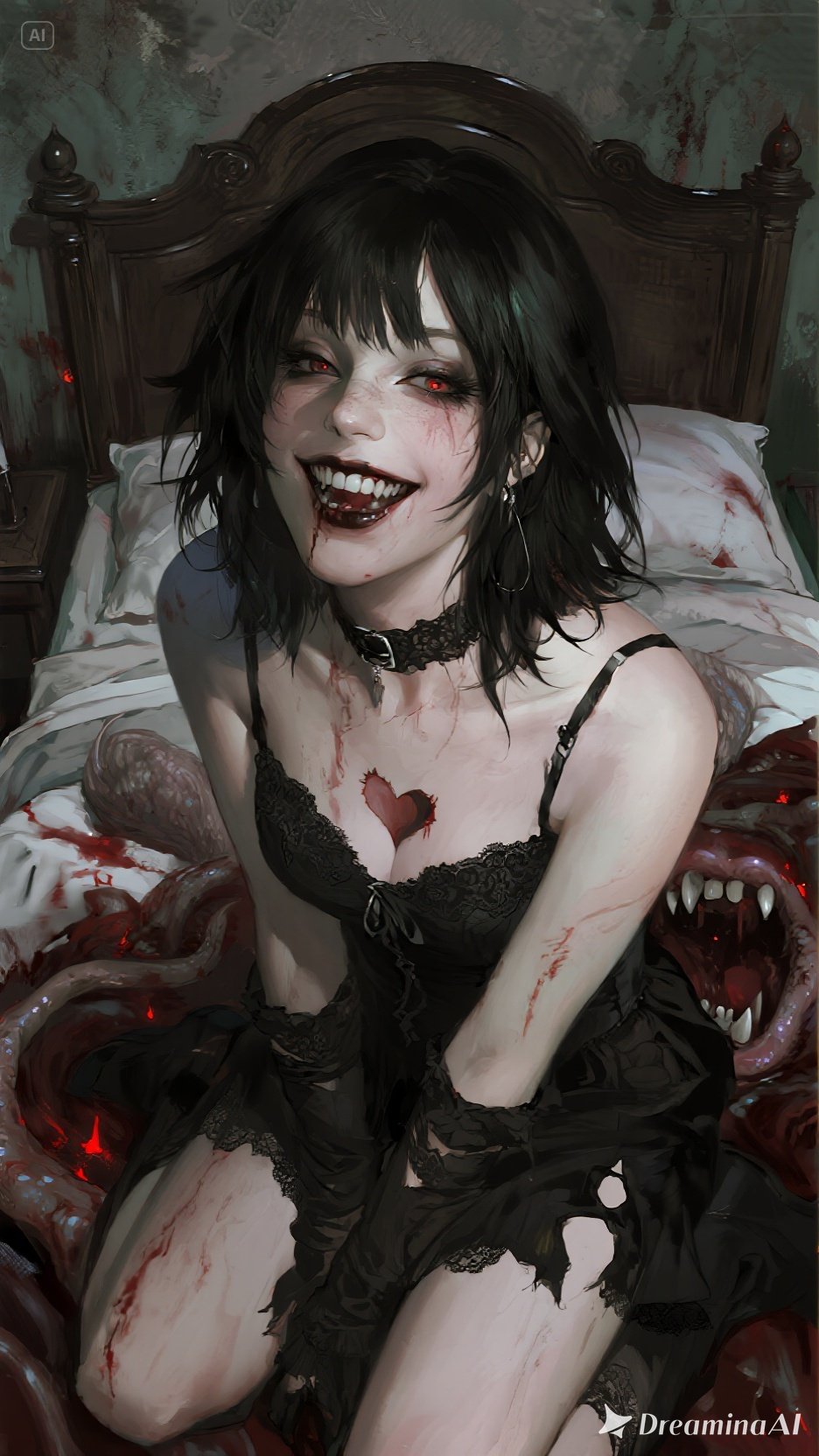 Dark surreal post-punk track in the style of Vera Choke: gritty chorus-drenched, bassline, sharp metallic percussion, pulsing darkwave synths, eerie whispered, backing vocals, Add creaking bed-frame samples, distorted heartbeat thumps, ghostly choirs, and glitchy reverb tails, Vocals are feral, intimate, slightly, unhinged, switching between breathy seduction and raw melodic rasp, Chorus grows huge with rumbling low-end, shivering pads and haunting harmonies, Atmosphere: a seductive nightmare inside a living, breathing bed that hungers, Cinematic, moody, rebellious, surreal, dreamlike horror aesthetic