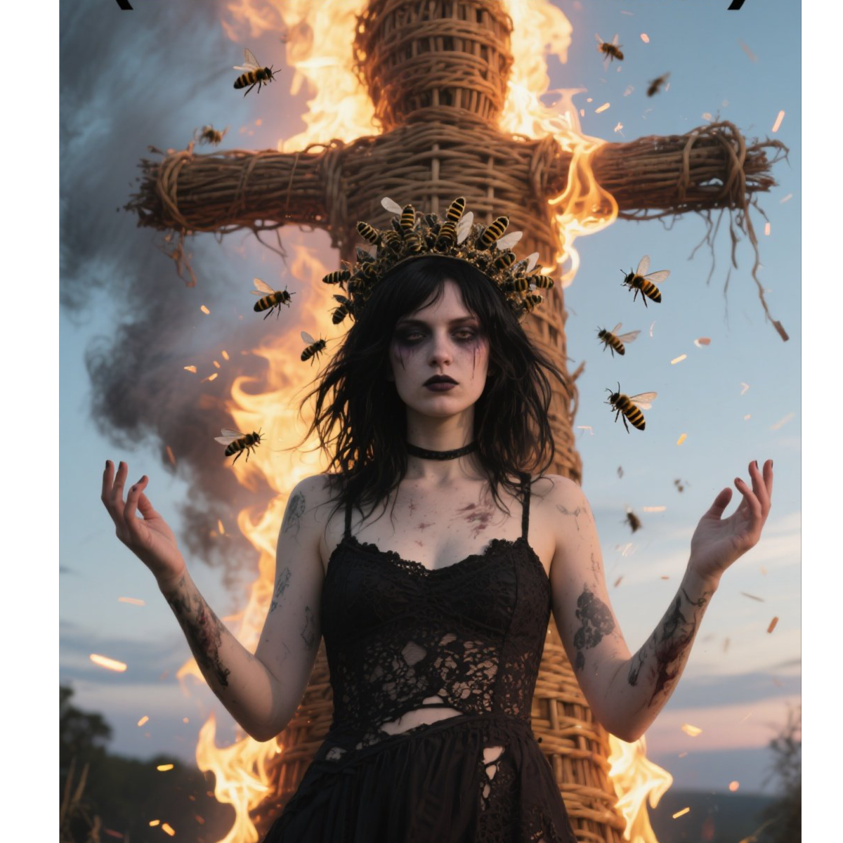 Genre: Dark Ritual Punk, Industrial Folk, Gothic Noise Rock, Tempo: 122 BPM, fluctuating, with pauses, like the breathing of a ritual, Drums: tribal, with dull tambourines, distorted bass hits, Guitars: feedback, reverb, dirty slides - the sound is like the buzzing of a beehive, Synths: analog, disturbing, pulsating, as if burning in the air, Bass: low, viscous, with a decay effect, Vera's vocals: verses - muffled and whispering, with microphone overload; chorus - a rolling, hysterical scream, like a ritual choir; the ending is a whisper-voice with an echo, like a prayer on charred ruins, Finale: the hum of bees turns into a heartbeat, then - silence and the click of a match