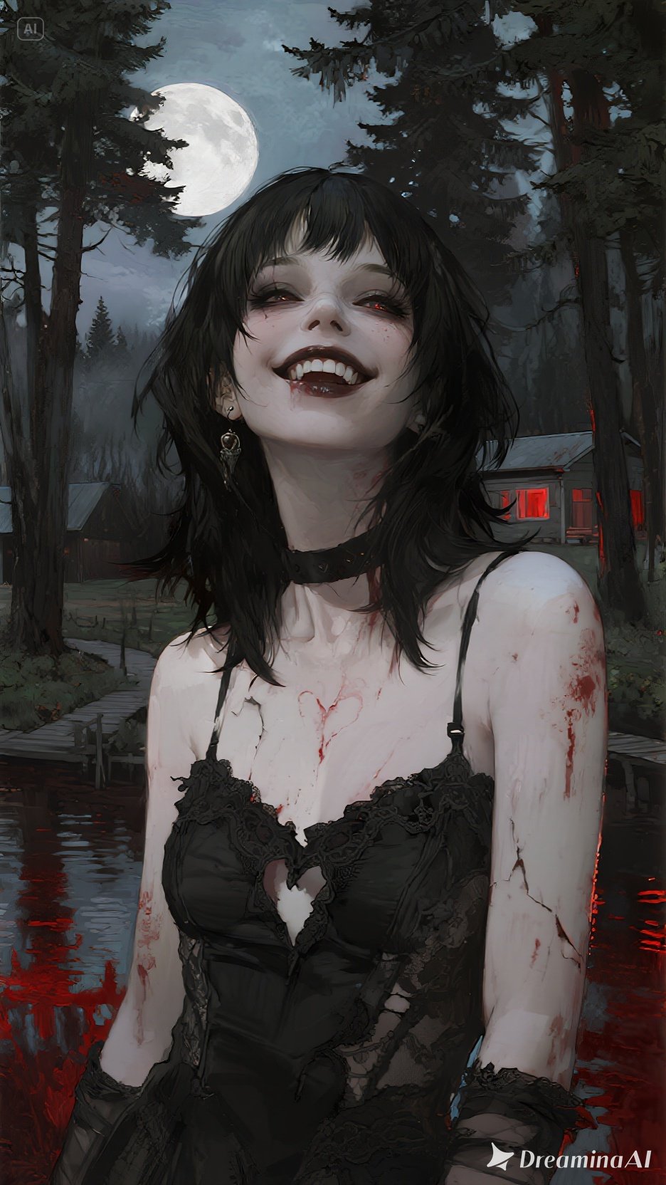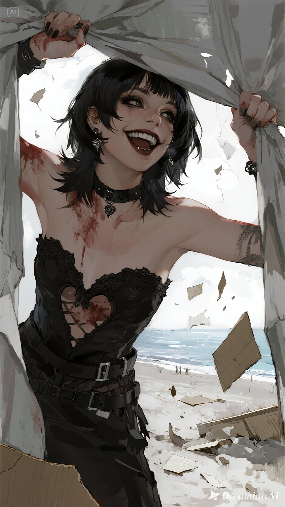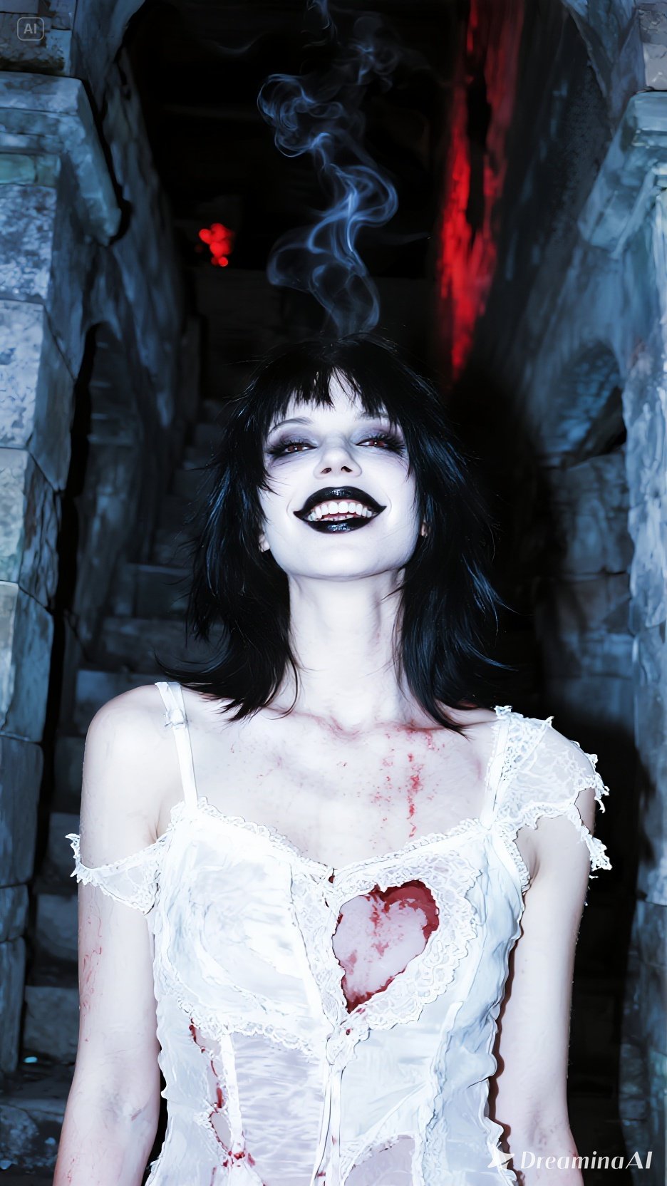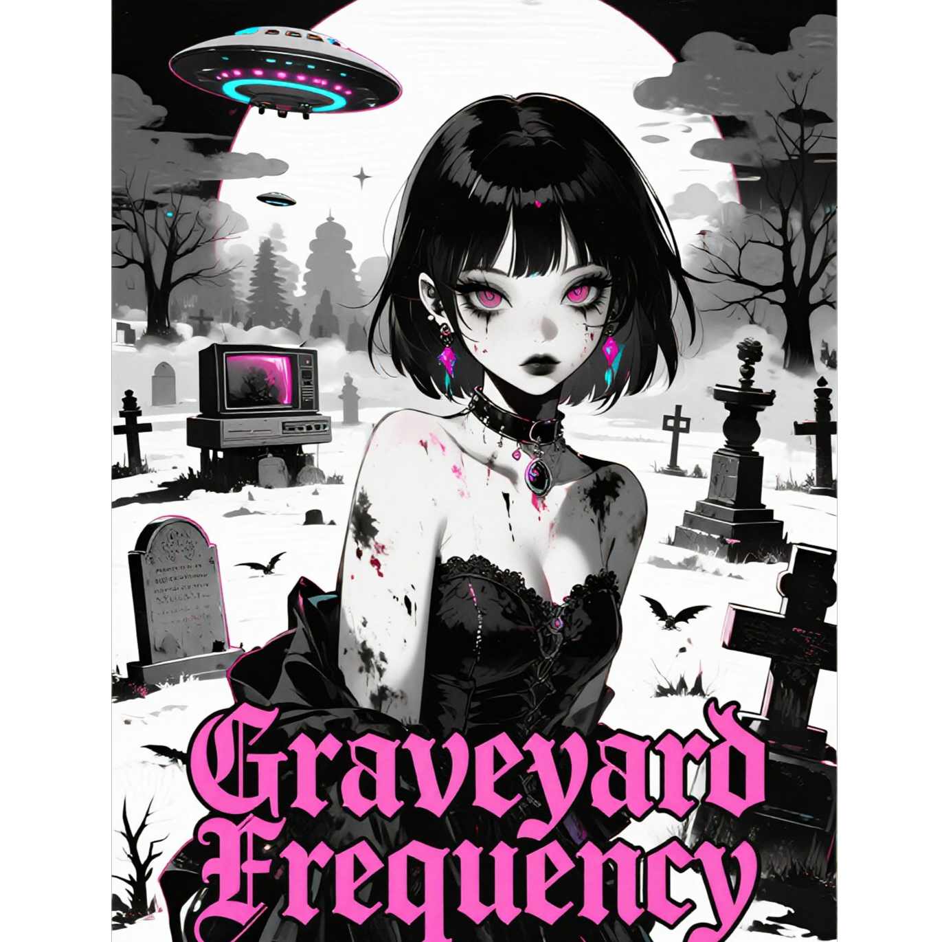 Dark post-punk female vocal, feral and breathy → distorted screams, 136 BPM, Gritty bassline with chorus and fuzz, cold metallic drum machine with tom-heavy fills, sharp staccato guitars soaked in icy reverb, Broken analog synth pads detuned by 25 - 40 cents, glitch-noise bursts in transitions, distant chanting backing vocals in the chorus, Verse vocals are close-miked, dry, with slapback delay; chorus vocals wide and layered with ghostly harmonies, Bridge drops bass completely, leaving whispered vocals + crackling static + pulsating low drone, Final chorus: full distortion wall, tremolo-shivered guitars, overcompressed drum machine, chaotic feedback tails, Mix: bass forward, drums punchy but grimy, guitars abrasive and wide, Mood: tense, feral, surreal, camp-horror aesthetic, stylishly unhinged but not comedic