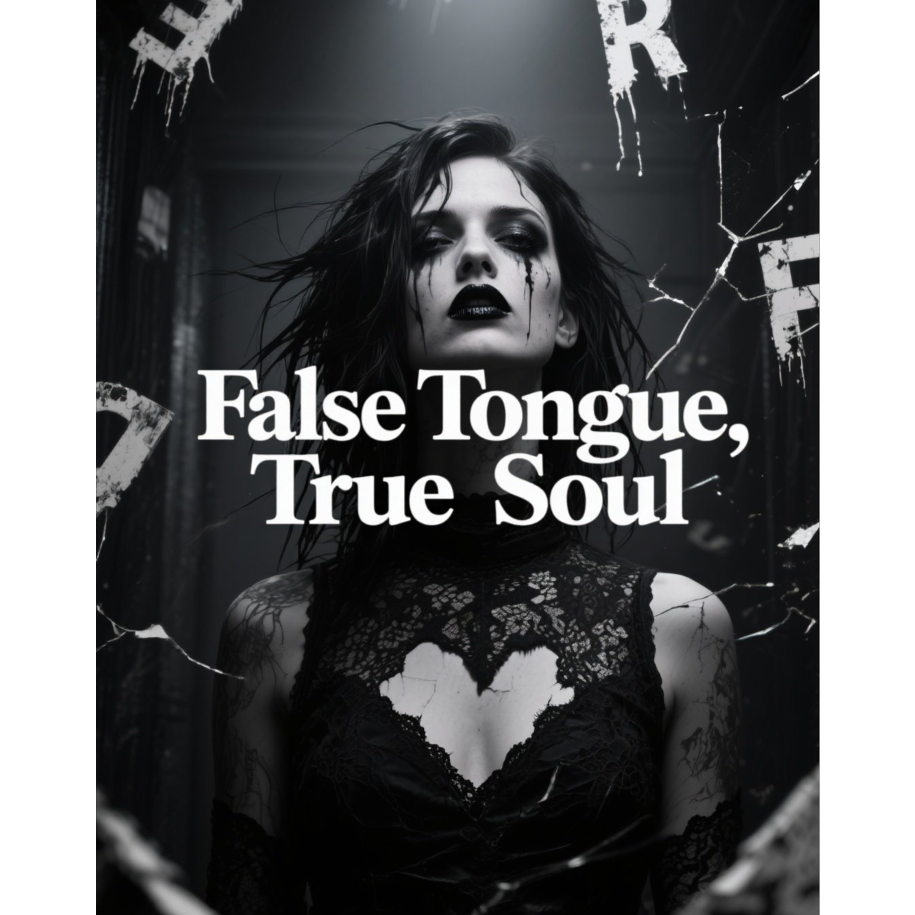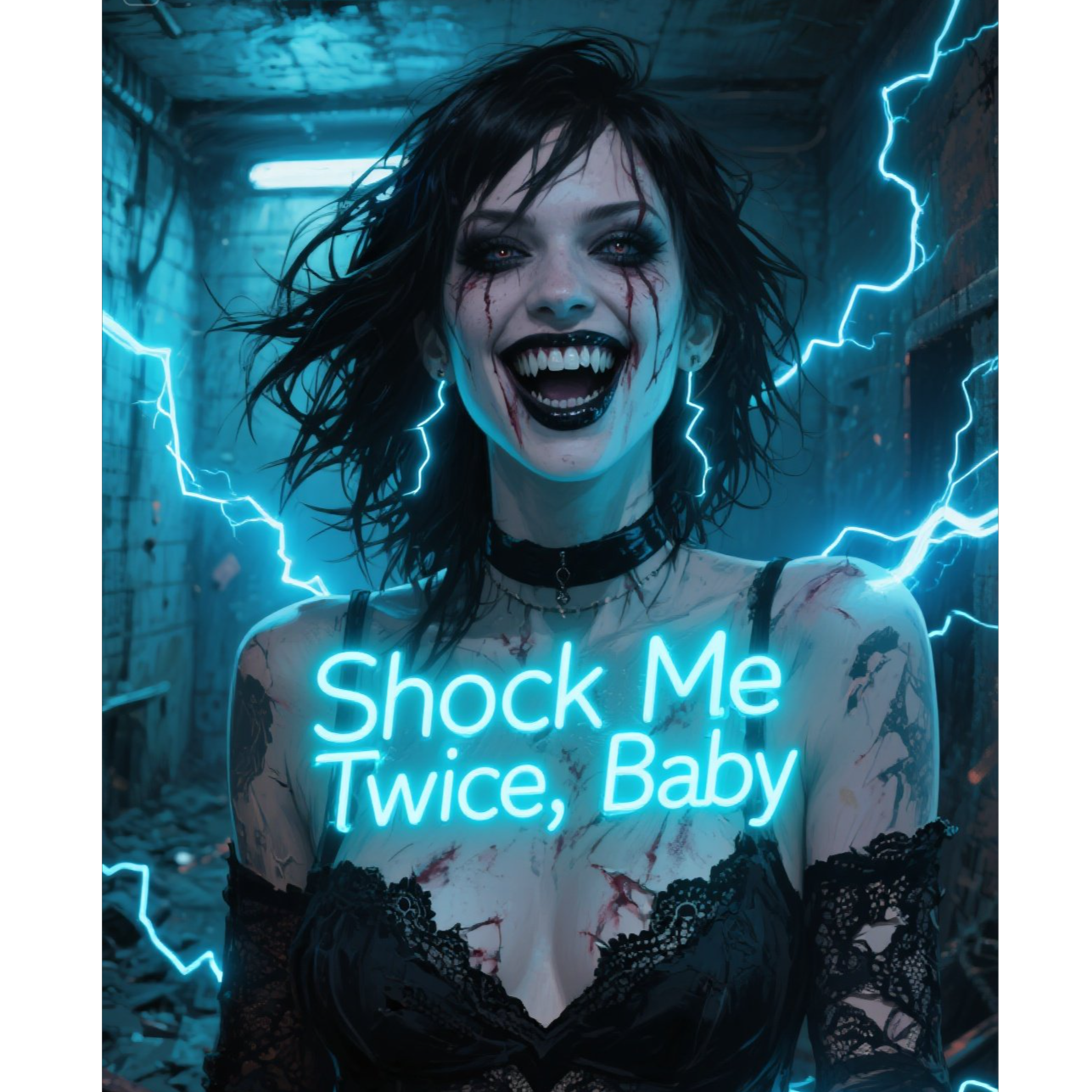 Tempo: 82 BPM, Genre: darkwave, gothic pop, post-punk minimalism, Mood: erotic-manic, fragile-mad, subdued-theatrical, Instrumentation: Cold, pulsating analog bass (slightly detuned), Sharp, brittle post-punk guitars with chorus, Dark pads with granular flutter (“breathing room” effect), Drum machine with deep, soft kick + sharp metallic snare, Whisper-vocals doubling the chorus lines, Occasional heartbeat-like thuds and tape-crackle textures, Bridge: distorted, rising synth swell like panic building under the floor, Vocal direction: Smoky, breathy, dangerously intimate, Occasional borderline-growling whispers, Chorus: uncomfortably close mic, like she sings from inches away