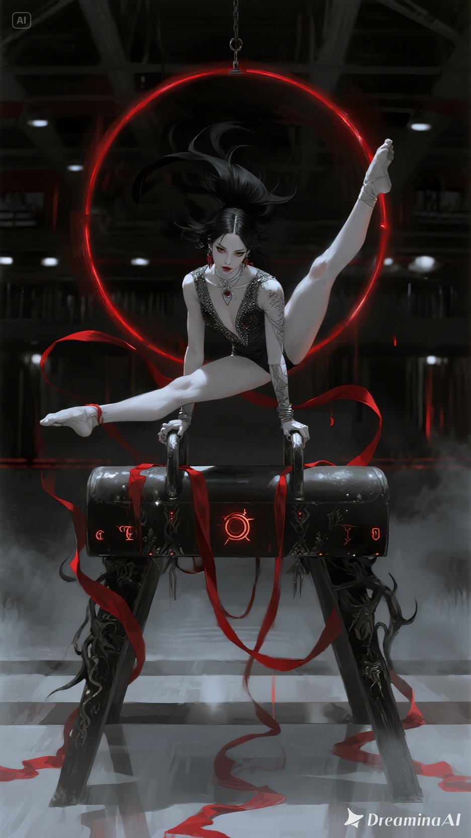 Dark absurdist alt-pop, experimental witch-electro, signature Vera Choke tension, Sharp percussive hits inspired by martial-arts choreography; metallic gym-apparatus clangs used as rhythmic elements; unstable detuned synth bass; warped vocal layers whispering ‘Gym-kata’ as glitchy percussive textures, Atmosphere: dangerous, theatrical, surreal, slightly comic but in a stylish way, Tempo: 138 BPM, mid-aggressive, angular rhythm switches, sudden silence cuts, twisted breakdown with echoing arena ambience, Key aesthetic: ritualistic pulse + absurd athletic danger, Primary mood: hyper-dramatic seriousness about something obviously ridiculous, Confident, icy, sarcastic female lead; whispered harmonics; breathy cyber-growls in transitions; spoken-word fragments like a prophecy about gymnastics combat, Metallic “pommel horse doom hit” every 8 bars, Rising arena-reverb sweeps before chorus, Unpredictable meter shifts to mimic stunts, Distorted breaths as rhythmic accents