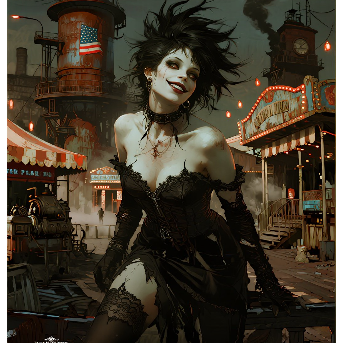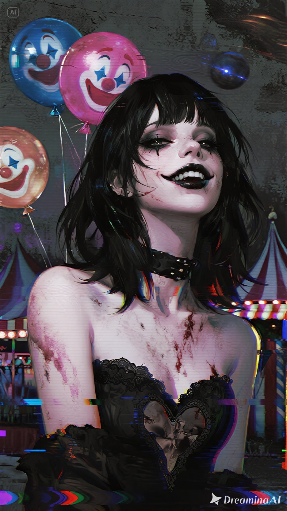 Dark surreal alt-pop, circus-horror aesthetic, Minimalistic but sharp percussion; metallic toy bells processed into eerie synth arpeggios; warped calliope-like pad buried under heavy reverb; pulsing analog bass wobble; soft distorted claps with delay; subtle whisper layers, Mood: seductive menace, theatrical gloom, cosmic carnival anxiety, Tempo 126 BPM, Chorus expands with wide shimmering pads and low growl bass, Bridge drenched in vaporous reverb with detuned fairground melodies, Slight glitching in vocal layers for “painted grin” and "tightrope" phrases
