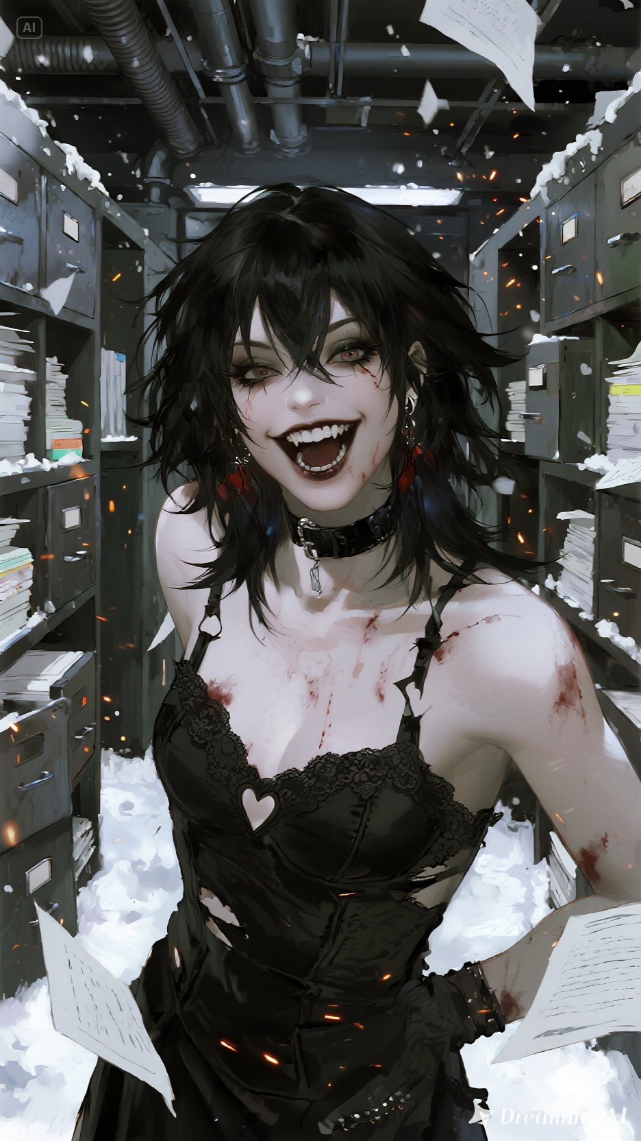 Dark post-punk female vocal, feral and tense, close-mic whispers shifting into explosive shouts, Gritty bassline with detuned growl, metallic clanks, typewriter percussion, malfunctioning synth arps like broken ministry machines, Sharp reverb, claustrophobic room tone, Chorus expands with distorted choirs, glitchy tape-warp harmonies, air-duct whooshes as rhythmic layers, Tempo ~124 BPM, Verse sections minimal: buzzing bass, clicking bureaucracy rhythms, eerie pads that swell like leaking steam, Bridge turns chaotic: whispered chants through static, alarms, fluttering paper FX, Final chorus erupts with soaring yet distorted vocals, industrial crashes, burning-paper crackle, ending with a lonely filing-cabinet slam and fading neon hum