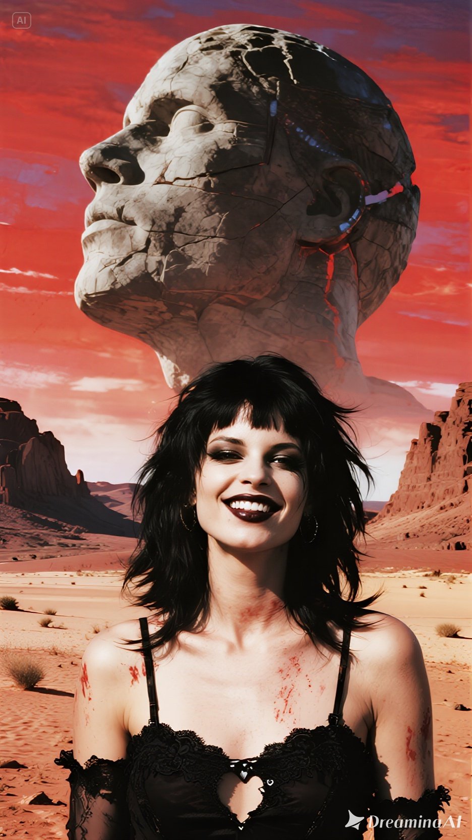 Dark surreal post-punk track in the style of Vera Choke: gritty chorus-soaked, bassline, metallic sharp percussion, pulsing darkwave synths, and tribal echo, drums inspired by bizarre retro-sci-fi, Vocals are feral, seductive, half-sung half-whispered with sudden emotional breaks, Add eerie background choirs, warped analog pads, distorted breaths, glitchy reverb tails, The chorus becomes larger, dramatic, with rising synth drones and hollow bass booms, Atmosphere: a ritual in a psychedelic desert under a floating stone head, Cinematic, moody, rebellious, chaotic but still melodic, dripping with surreal dark energy
