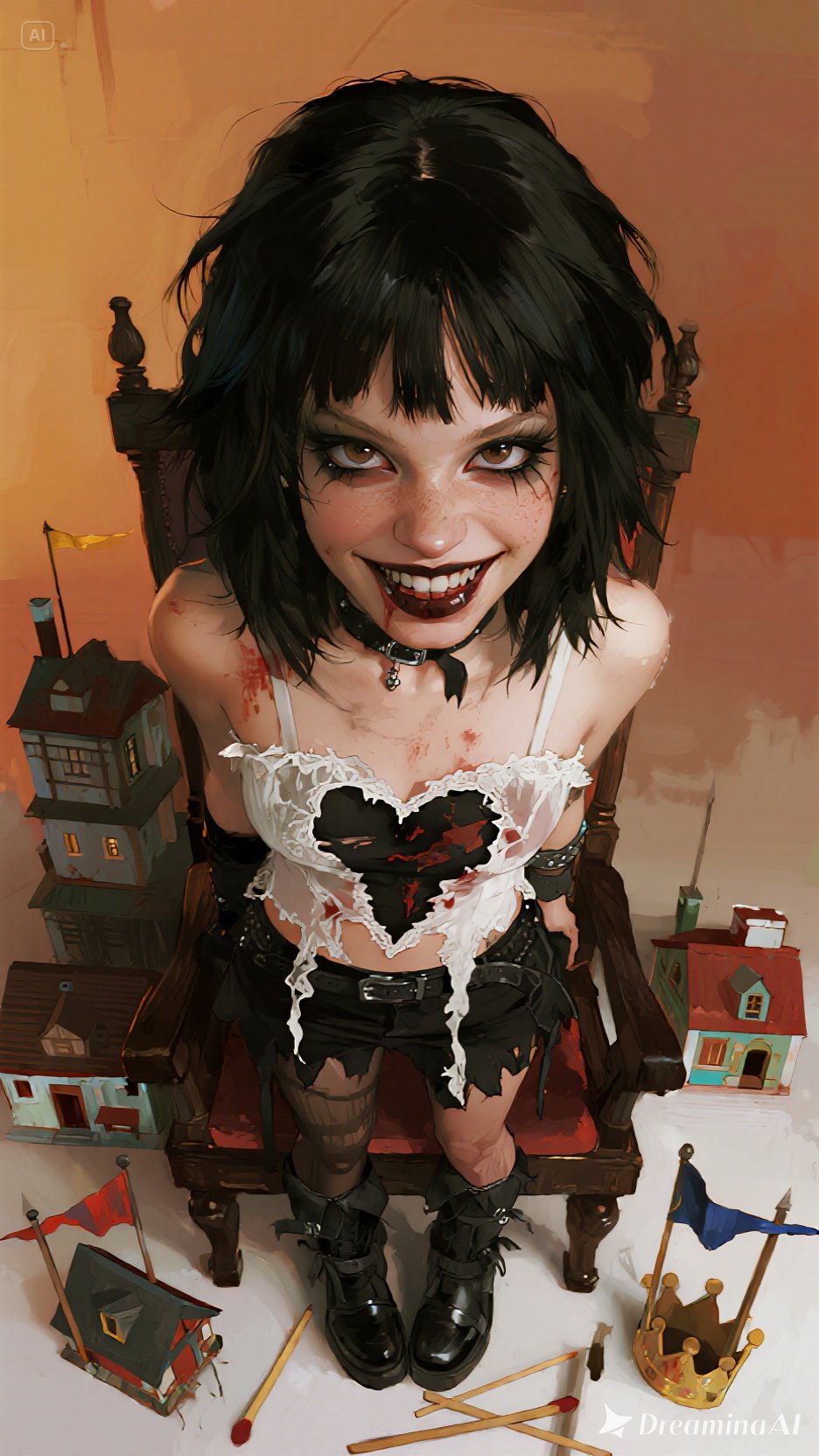Tempo: 118 BPM, Genre: post-punk, darkwave with playful dissonance, Mood: bold, surreal, dangerously playful, Instrumentation: Dry, punchy post-punk bass (fast, Peter Hook-like riffs), Metallic drums, clanging toms, short-gated snare, Toy-synth glissandos (as if "breaking children’s instruments"), Distorted guitar stabs with chorus/flanger, Whispers doubled with childlike pitched vocal FX, Bridge: rising, grainy feedback swell (controlled), Vocal direction: Half-sung, half-snarled delivery, Feral grins in the phrasing, breathy growls on select words, Backing vocals: soft, creepy "tiny army" chants in the distance, Atmosphere: Surreal, but not cringy, City alarm + children's game, but in the style of "I find it funny because everything is on fire, "